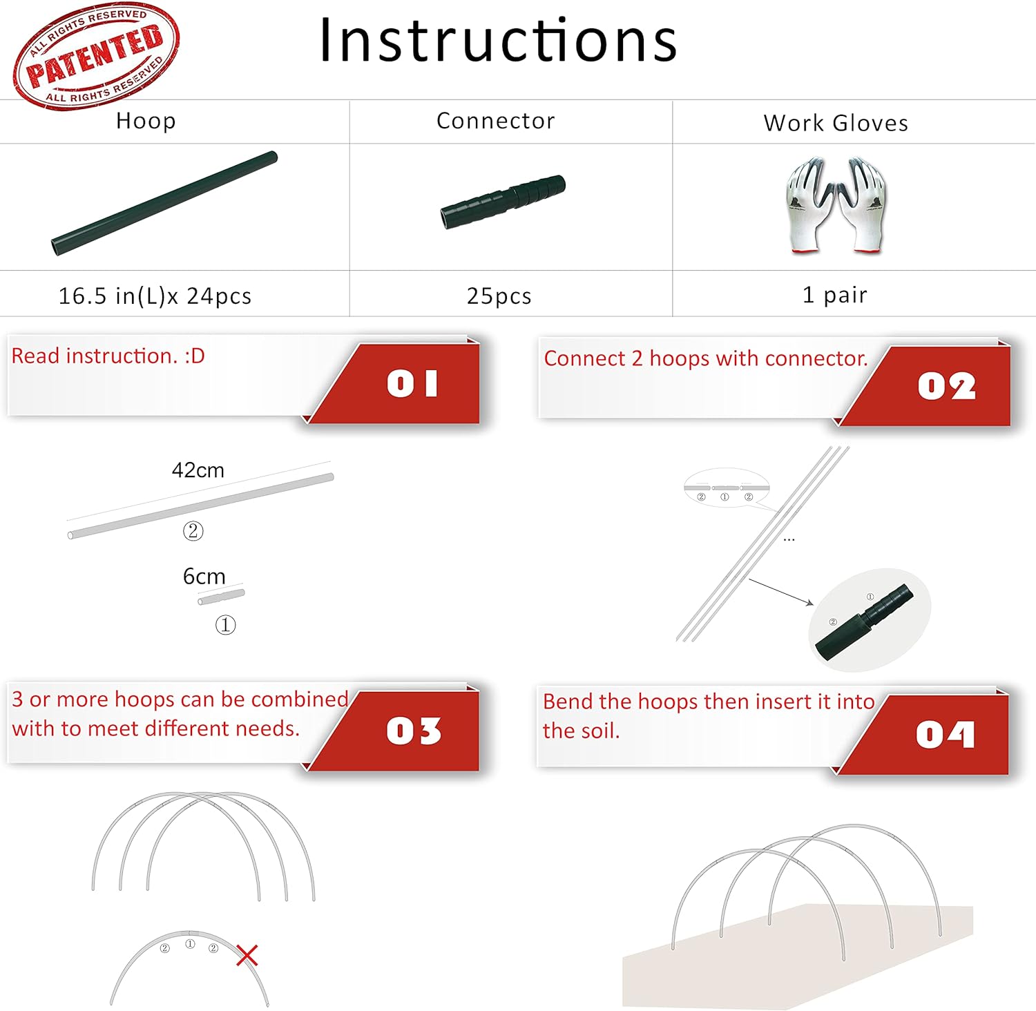 • DIY Kit Includes - Comes with 48pcs hoops frame, 1/2" in diameter, 17inches in length, 50pcs connectors, 12pcs cross connectors, 12pcs plugs, 1 pair of work gloves.