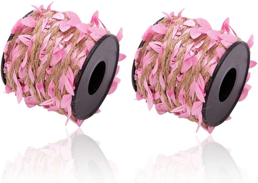 Burlap Leaf Ribbon 2 Rolls 66 Feet 5mm Jute Burlap Twine Vine with Artificial Leaves for Crafts Jungle Garland Party Wedding Garden Home Decoration Pink