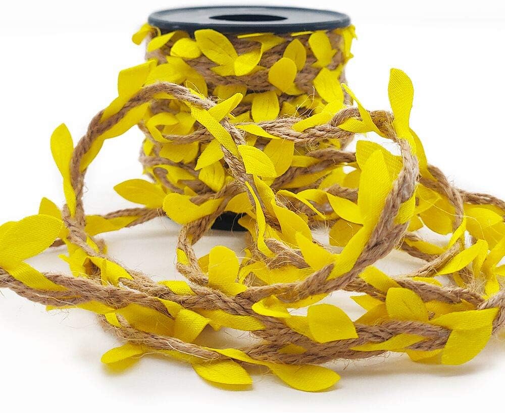 66 Feet Total Burlap Yellow Leaf Ribbon 2 Rolls 5mm Natural Jute Vine with Artificial Leaves Ribbon for Crafts Jungle Party Wedding Garden Home Decoration Twine