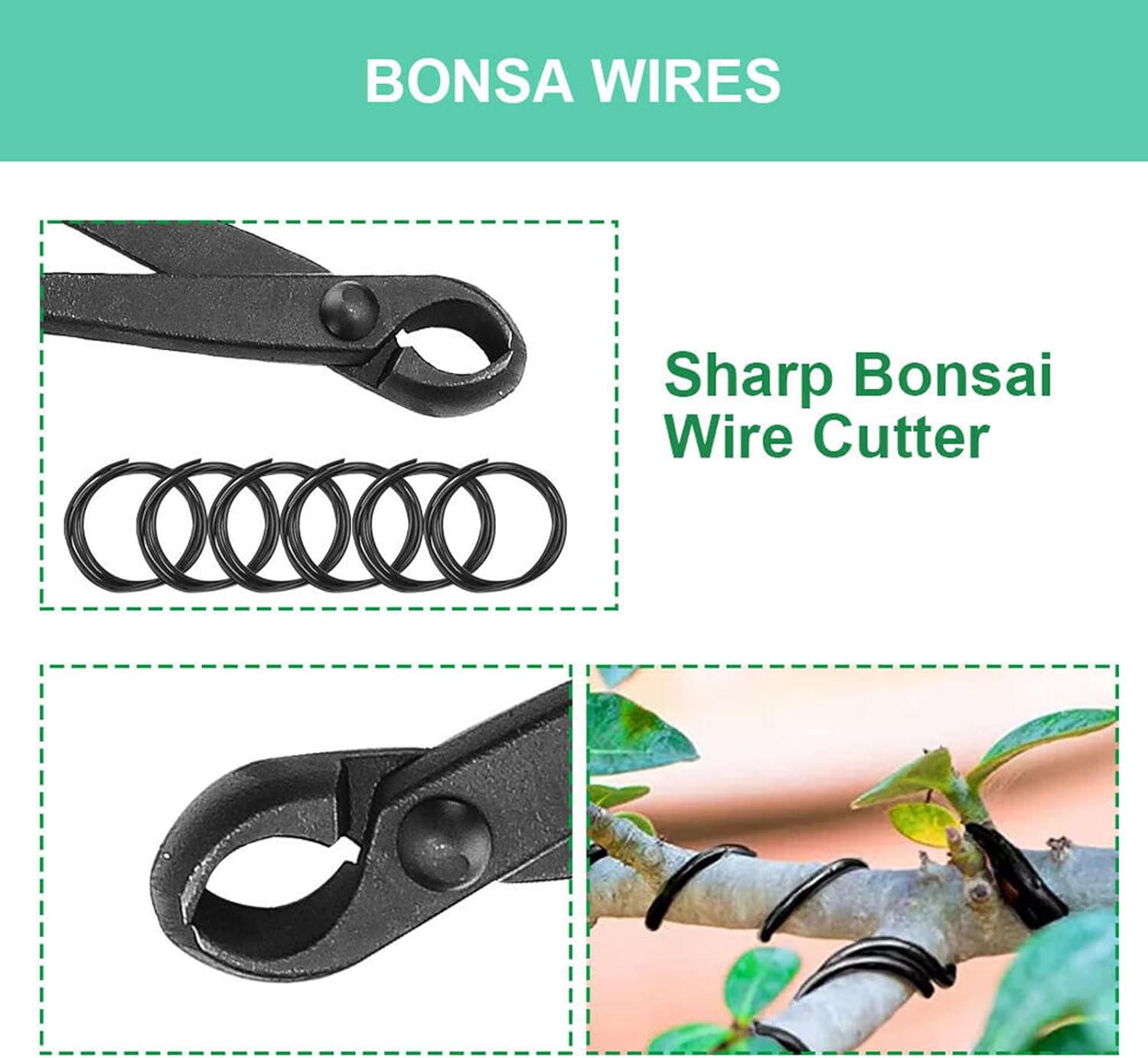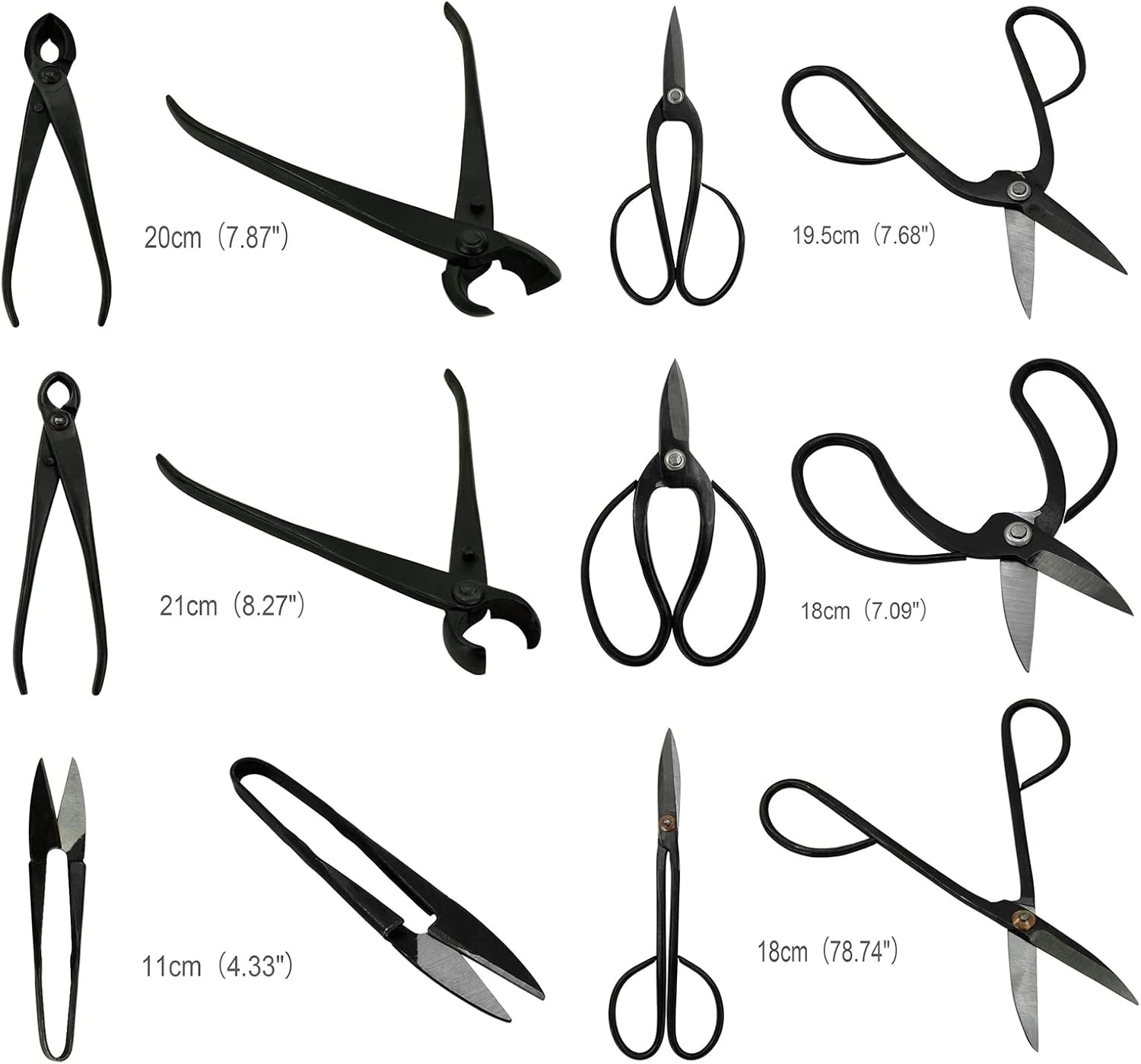• 10 carbon steel Bonsai Tools Kit Set including Leaf Trimmer, Scissors, Jin pliers, Root Hook, Knob Cutter, Aluminium Wires and Wire cutter, etc. All well packed in a Nylon zipped case.