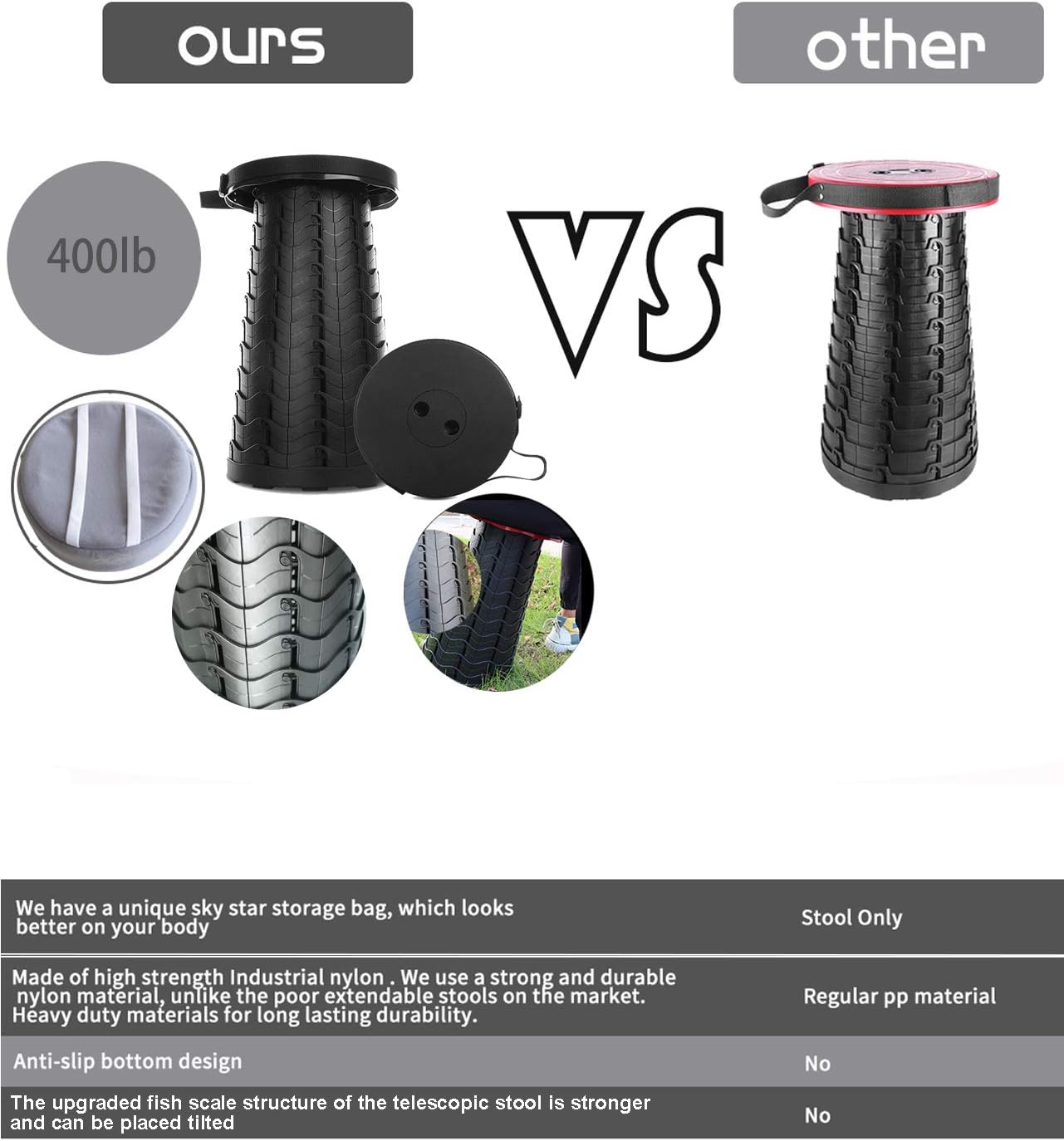 • 💖US.PATENTED FISH SCALE STRUCTURE : US.patented design fish scale structure and modified plastic material endow the collapsible stool with extraordinary strength and rigidity. The real load capacity reaches 397 lbs, far exceeding other brands. Sitting shattered within a year, please contact us to change the new one
