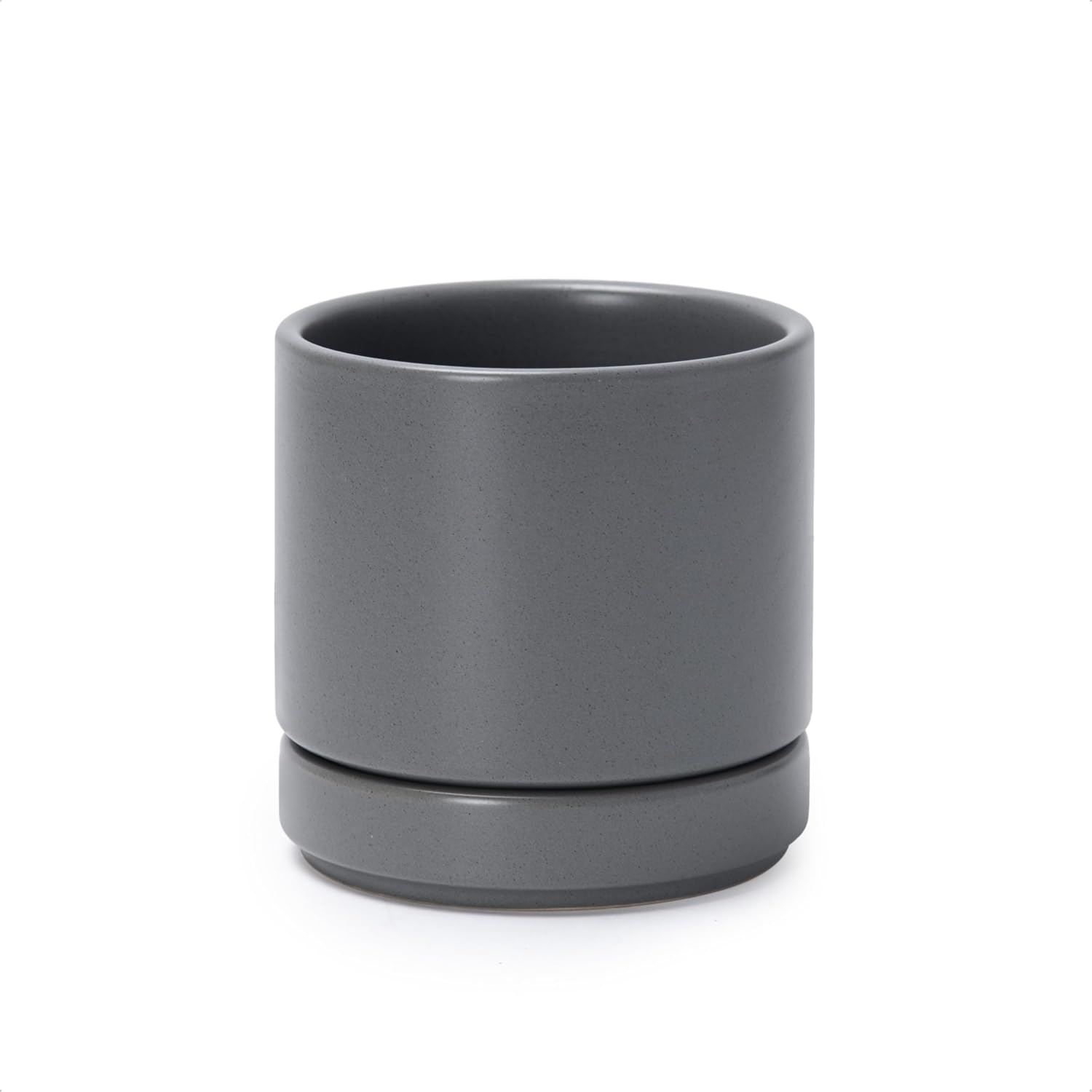 D'vine Dev 4.7 Inch Ceramic Planter Pot with Drainage Hole and Saucer, Indoor Cylinder Round Planter Pot, Grey, 94-O-B-3