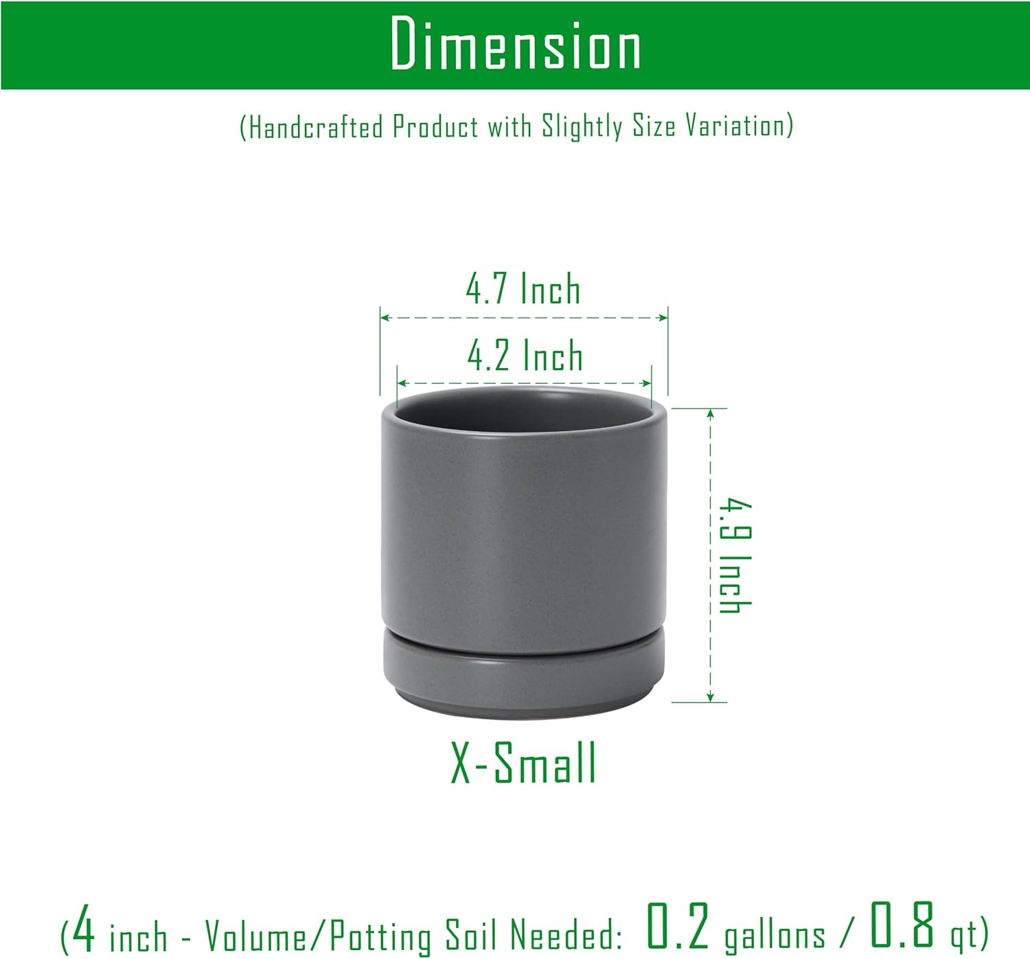 • X-Small 4.7 Inch Planter Pot: 4.7" Diameter x 4.9" H, grey color. Potting Soil Needed: 0.2 gallons / 0.8 qt.