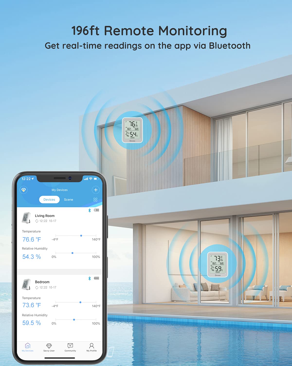 • Easy to Connect: Simply download the Govee Home app, search for and select H5075, and pair it successfully within minutes. With a 196ft/60m Bluetooth range, you'll be notified of any air changes immediately.