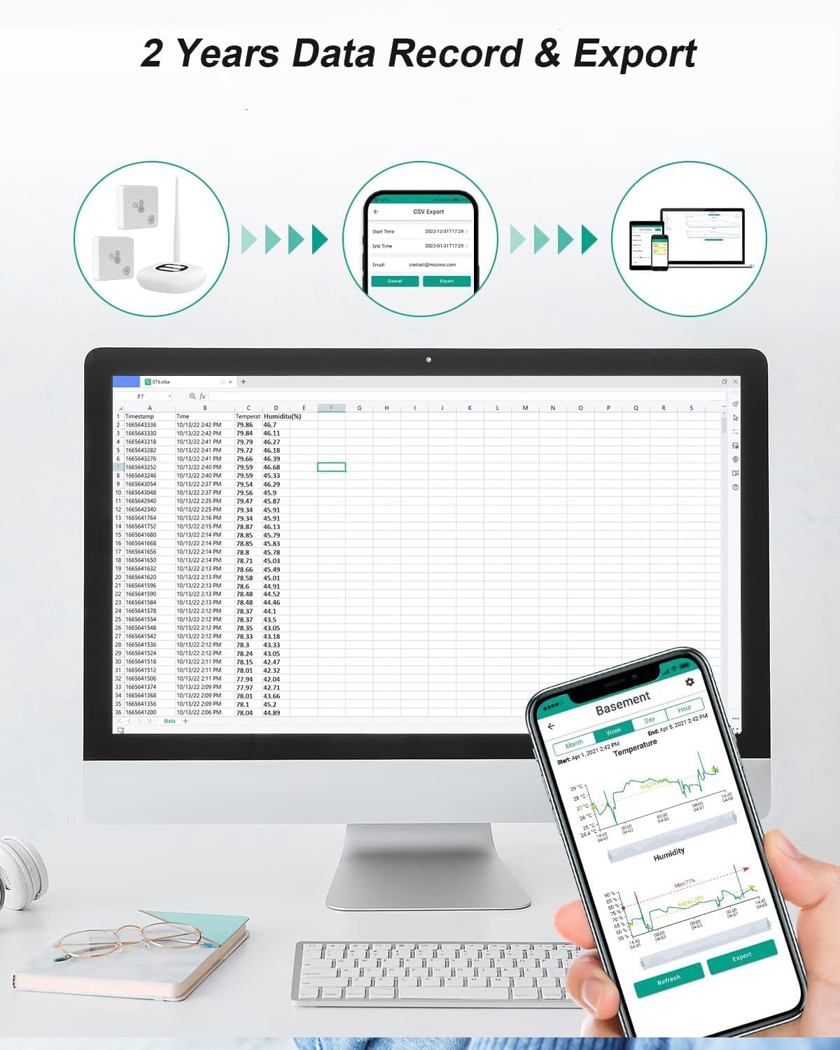 • 2-Year Data Storage and Export: The smart temperature sensor on MOCREO APP provides clear charts for tracking temperature/humidity trends over time. You can enjoy 2 years of free data storage and CSV table support for detailed analysis