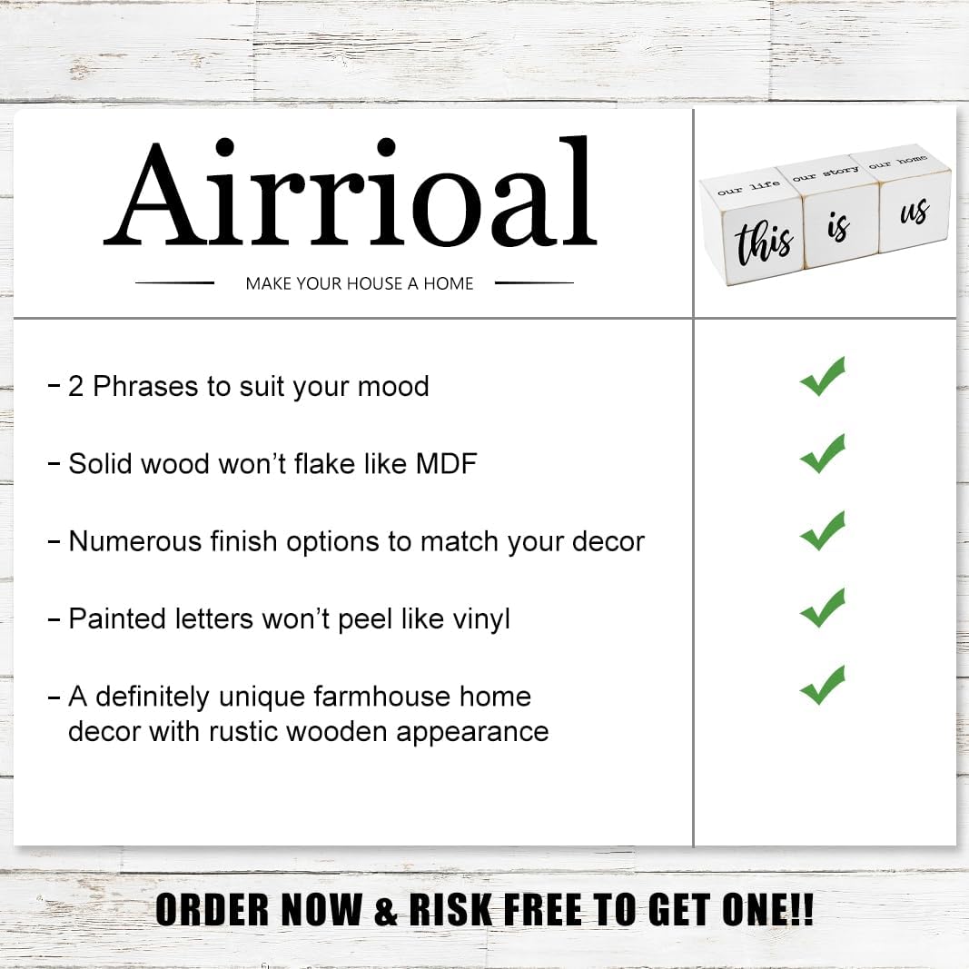 • Handcrafted Wooden Blocks - This listing is for 3 double-sided blocks with this is us on the front and “our life“ ” our story “ ”our home“ on the top, which adds farmhouse atmosphere to your home.