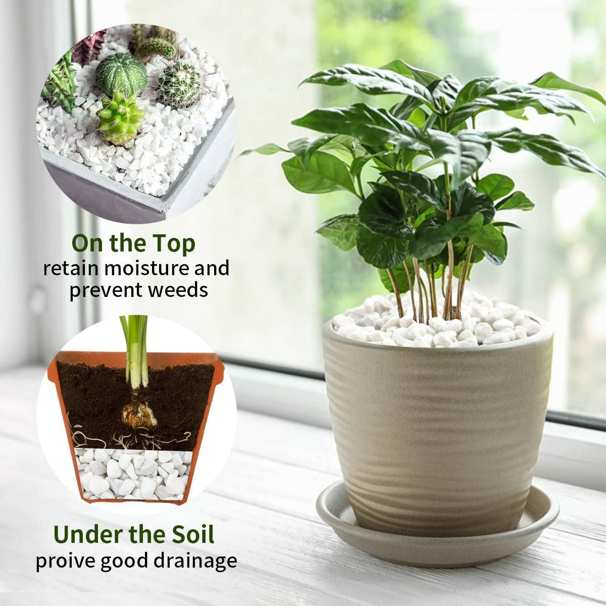 • 【White Rocks】Small white stones are polished without sharp edges and will not harm your succulents or potted cactus. Covering the soil with a layer of white gravels will not only make your succulents stand out, but also keep the soil moisture and help plants grow better. Spread white rocks over the soil surface of indoor potted plants to create a clean and tidy appearance