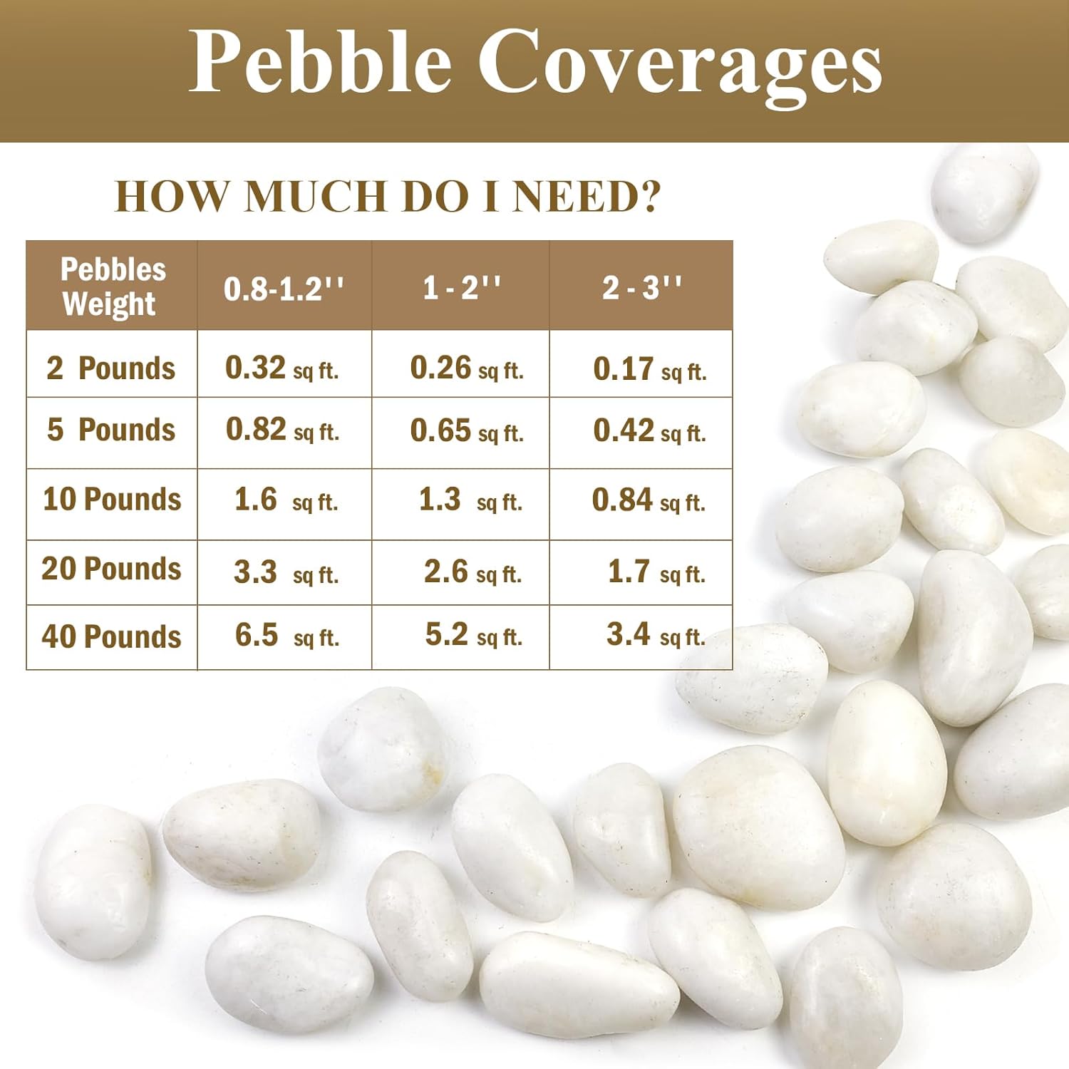 • 【5lbs white pebbles】5lb high polished white pebbles is about 0.8-1.2 inch. Due to machine screening, some stones will exceed 1.2 inch in length. This lovely decorative white pebbles is not pure white, there are a few grey pebbles and yellow pebbles in it. But they are very clean and have no dust or powder attached