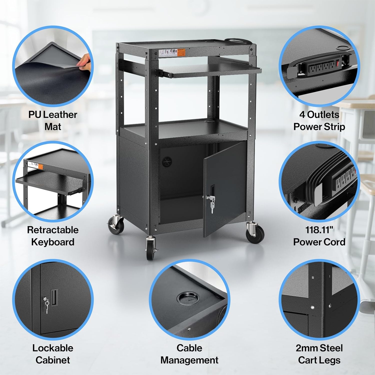 Steel Large AV Cart with Locking Cabinet - Adjustable Height Media Carts with Wheels, Pullout Tray, Power Strip for Mobile Work Station - Rolling Computer Cart for Office Classroom Presentation