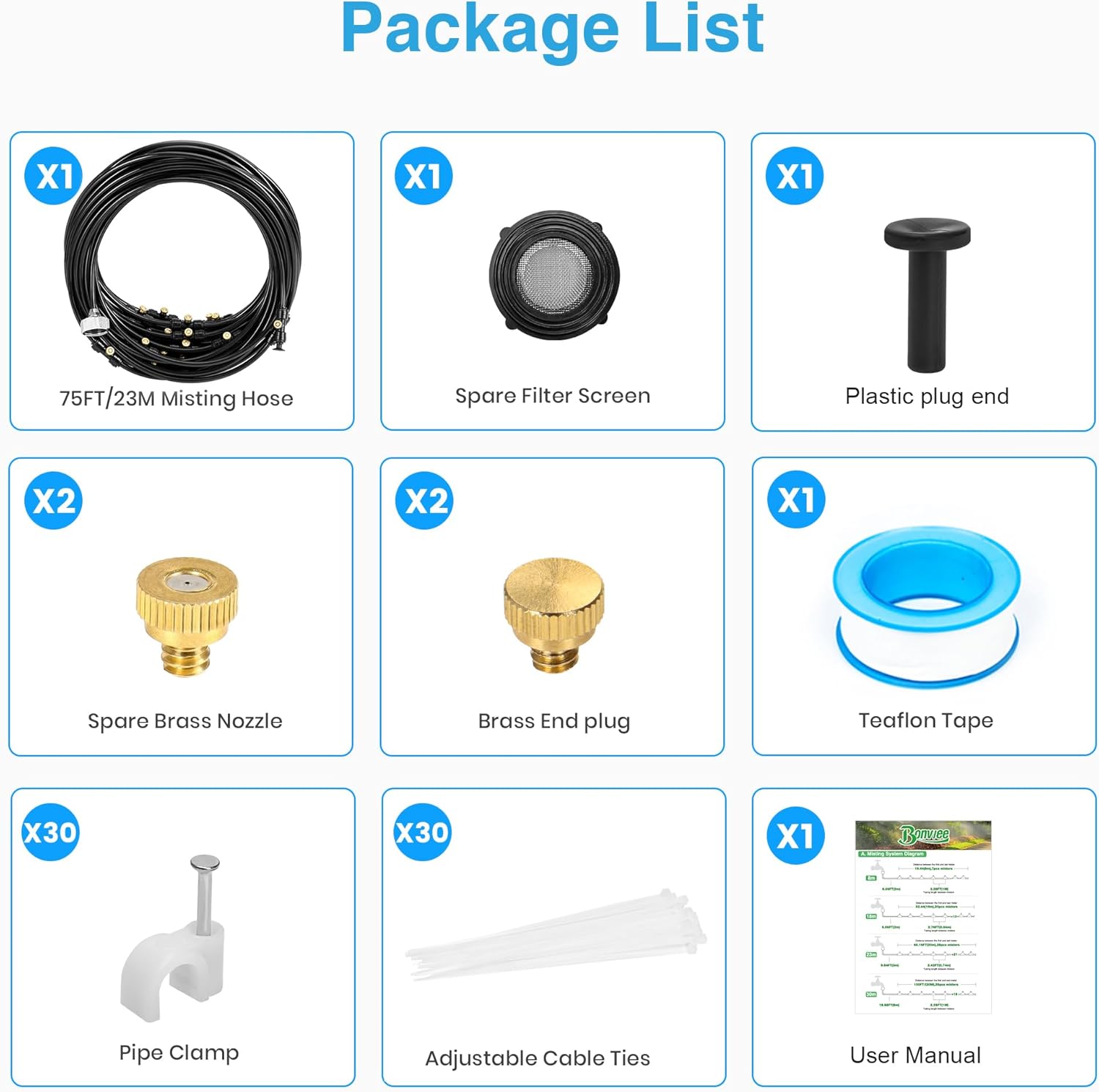 • 🏡 75FT Misting System For Large Setups: Equipped with 75FT (23M) tubing and 28 high-quality brass nozzles, great for cooling large patios, greenhouses, trampolines, umbrellas, pet zones, and more. Effective and easy to install.