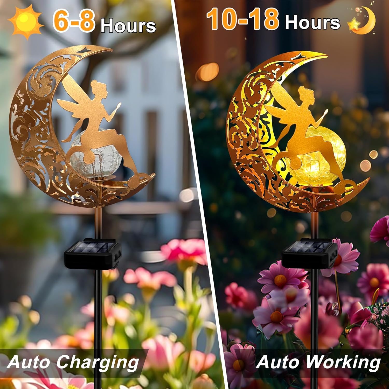 • 【Easy Installation & IP 65 waterproof】: Crafted from high-quality metal materials, this solar garden decor lights is IP65 waterproof and rust-proof, ensuring durability and longevity. Designed for hassle-free use, it requires no complex assembly, allowing you to place it anywhere to enhance your outdoor decor. Create your dream garden ambiance with our Fairy Moon Figurine Light Stake.