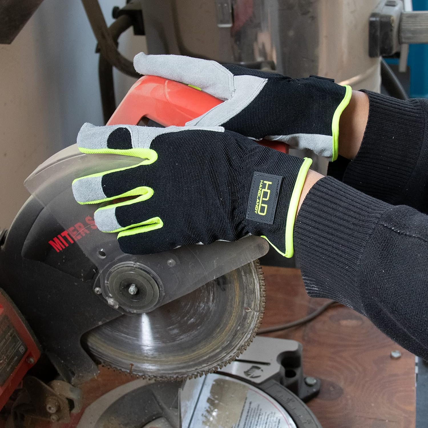 • Premium Shoulder Split Cowhide Leather Palm: One piece palm design leather working gloves provides maximum dexterity & durability & grip.