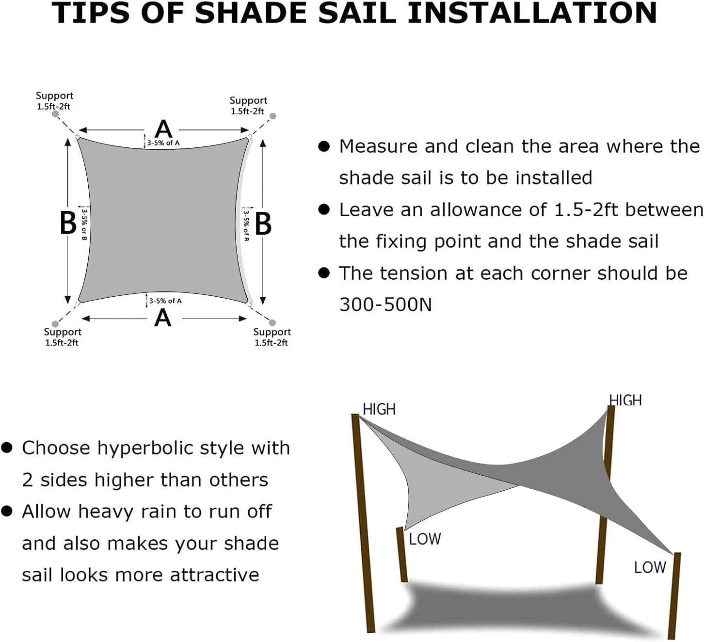 • Resistant Sun Sail: The shade sail protects your children, flowers, plants and cars safe from exposuring under the sun by blocking up to 95% UV rays. significantly reduce the temperature and UV sunlight in shaded area during summer time, ideal for patio, swimming pool, balcony, carport etc