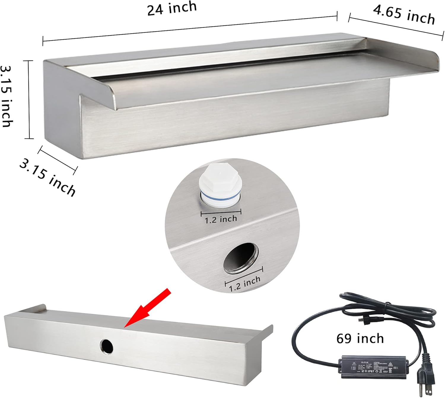 • ❤【DECORATION POOL FOUNTAIN】PONDO 24" LED waterfall spillway makes your patio and swimming pool elegant, fashionable and beautiful. The color change of LED lights and the gentle sound of water running make your patio more special at night. It comes with one spillway, IP68 led strip, remote, IP67 adaptor and supply cord.