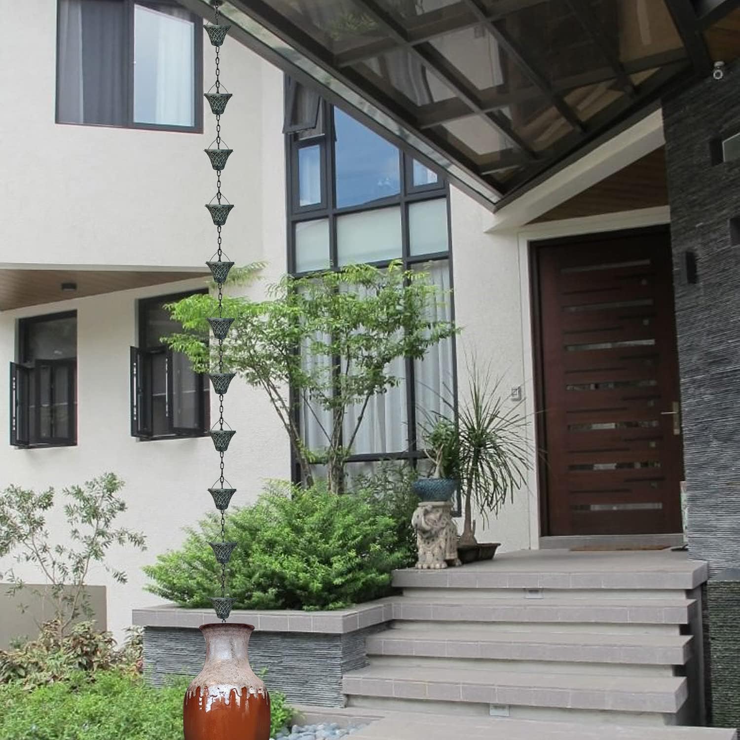 • ORNATE DESIGN: Our rain chains feature 12 bell cups with 5 antique color finishes that complement any roof or garden decor.