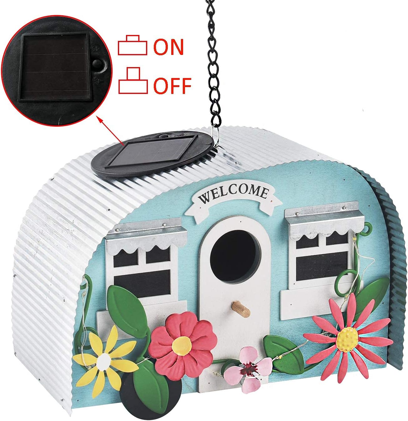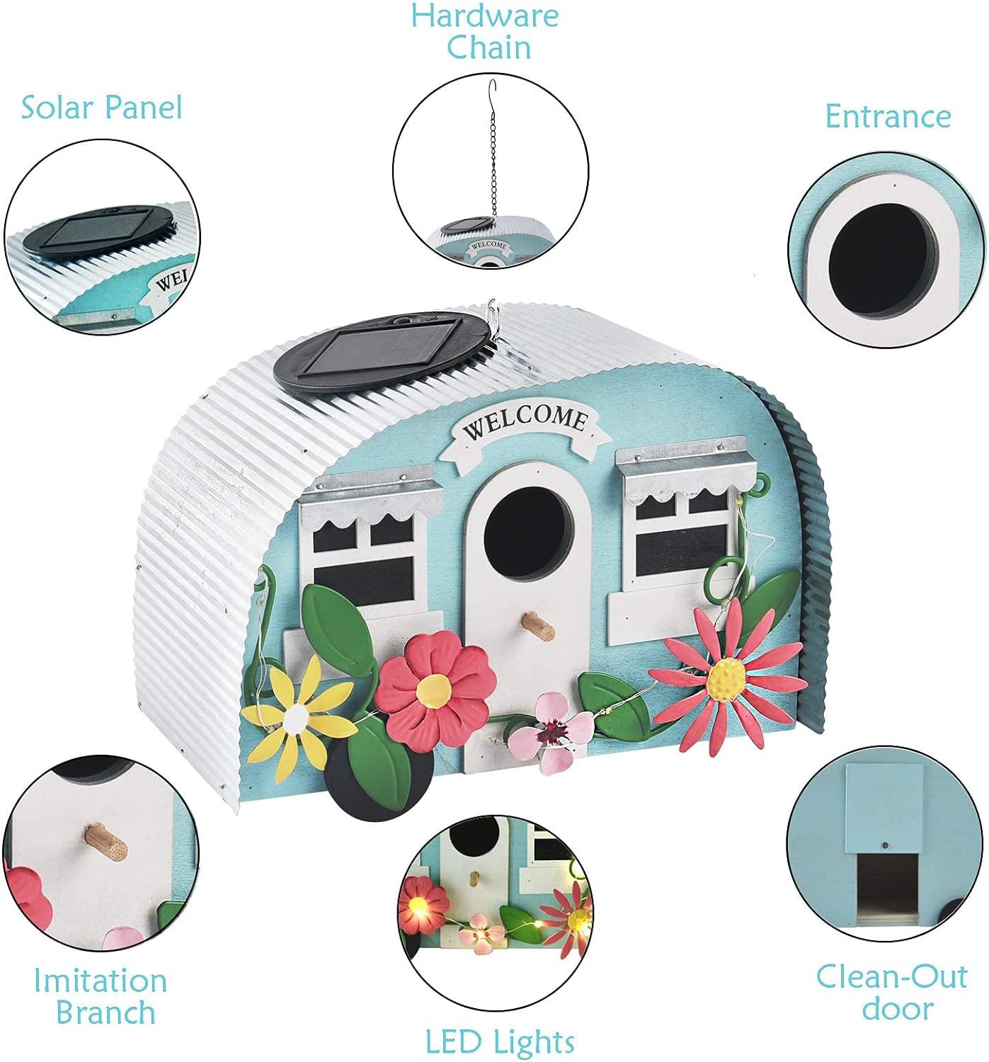 • Eye-Catching Handwork Birdhouses: The birdhouse looks like a little vintage camper trailer with flowers and a string warm white LED. It adds a fun and unique design element to your outdoor spaces.