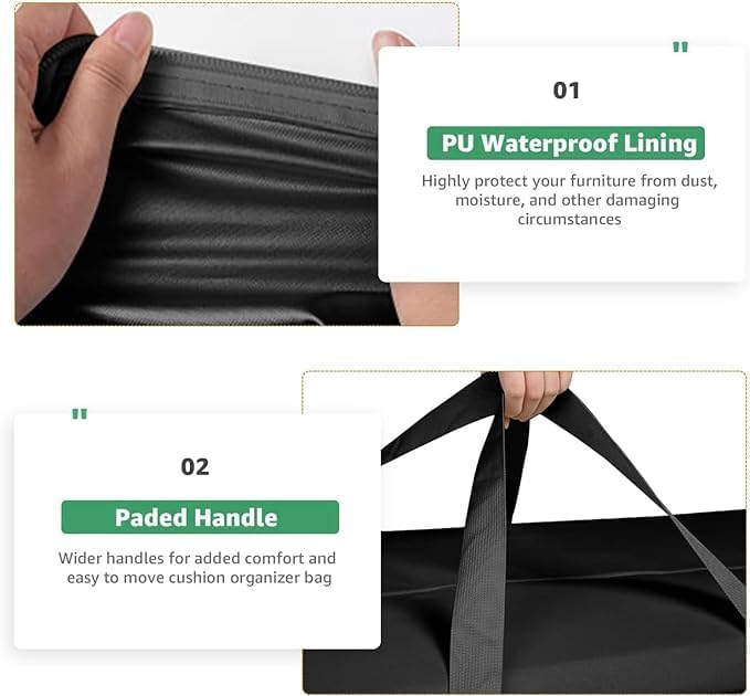 • 【Zipper & Handles】- This outdoor cushion storage bag is designed with flexible zipper that can cover the patio cushion quickly and easily. Durable and non-slip handles are helpful to carry conveniently cushion storage bag.