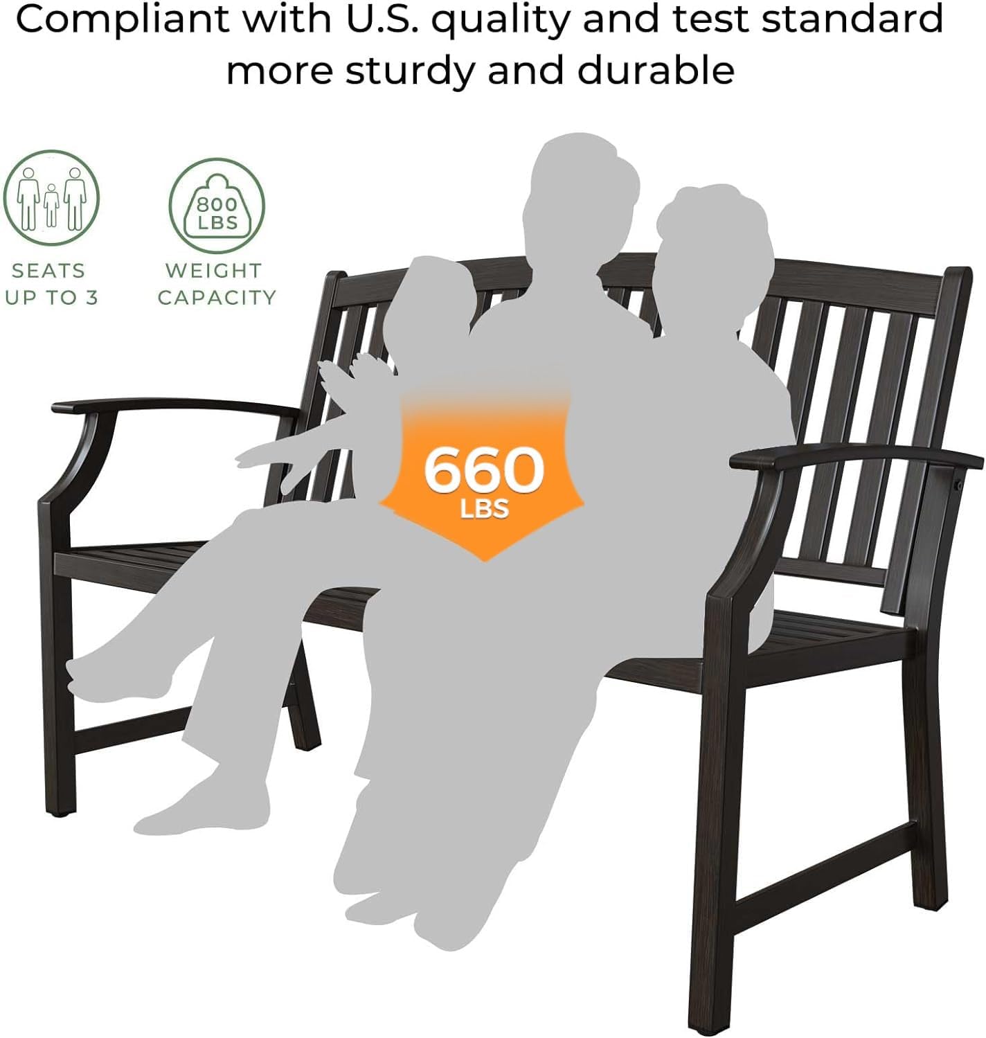 • 【STURDY STRUCTURE】This metal frame of outside bench provide thickened iron pipes and aluminum back and seat that have better strength, can hold up to 660 Pounds