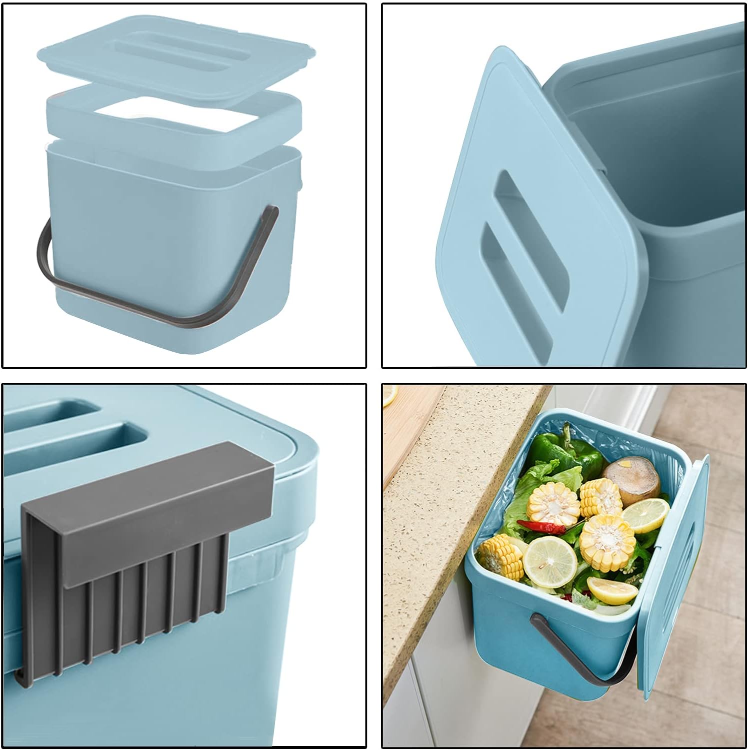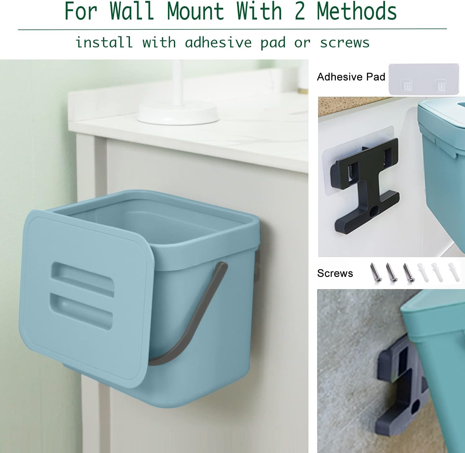 • Wall Mount/Under Sink/Countertop Trash Can: The small trash can with lid can be easily hung on kitchen cabinet doors, pantry doors. (The thickness of the door should be less than 0.86 inch) Moreover, this food waste caddy can also be wall-mounted to under sinks, cupboard, kitchen wall or bathroom wall with adhesive pad or screws.