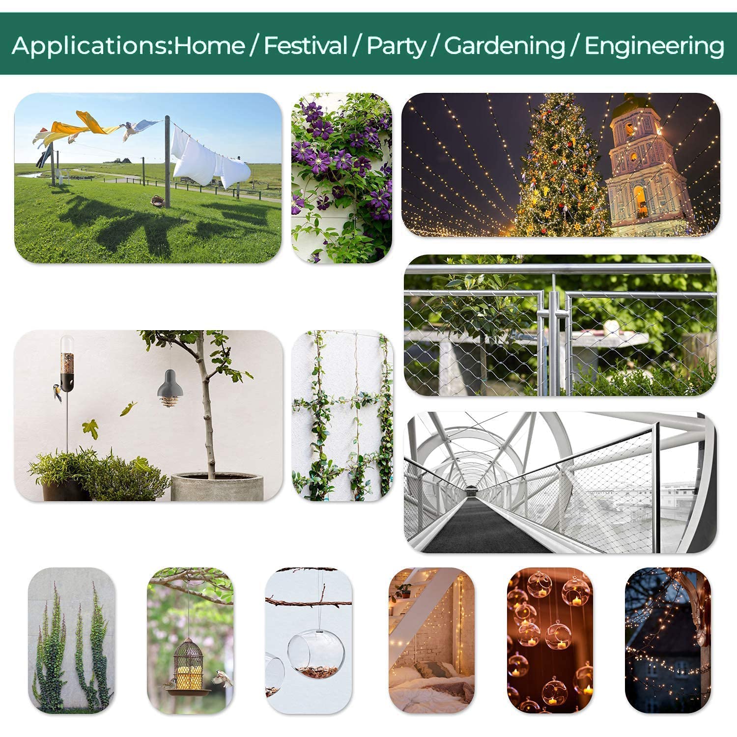 • 【Multi Application】:Suitable for outdoor applications such as tent ropes, clotheslines, outdoor hanging lights, deck cable railings, picture displays, etc. It can also support climbing plants, garden railings, canopies, pergola, etc.