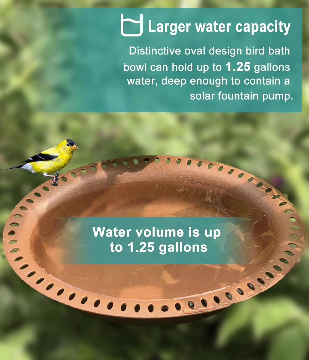 • More capacity & Oblong shape: This extra-large bird bath has an OBLONG tray with small holes along the edges, providing a stable standing and resting environment for the lovely bird friends. Bird friendly color--Chocolate color basin is gentle and unobtrusive in your outside areas, and deep enough for contain a solar fountain pump. (Bowl dimension: 17.2” L × 13.2” W, bowl depth: 2.76 inches.)