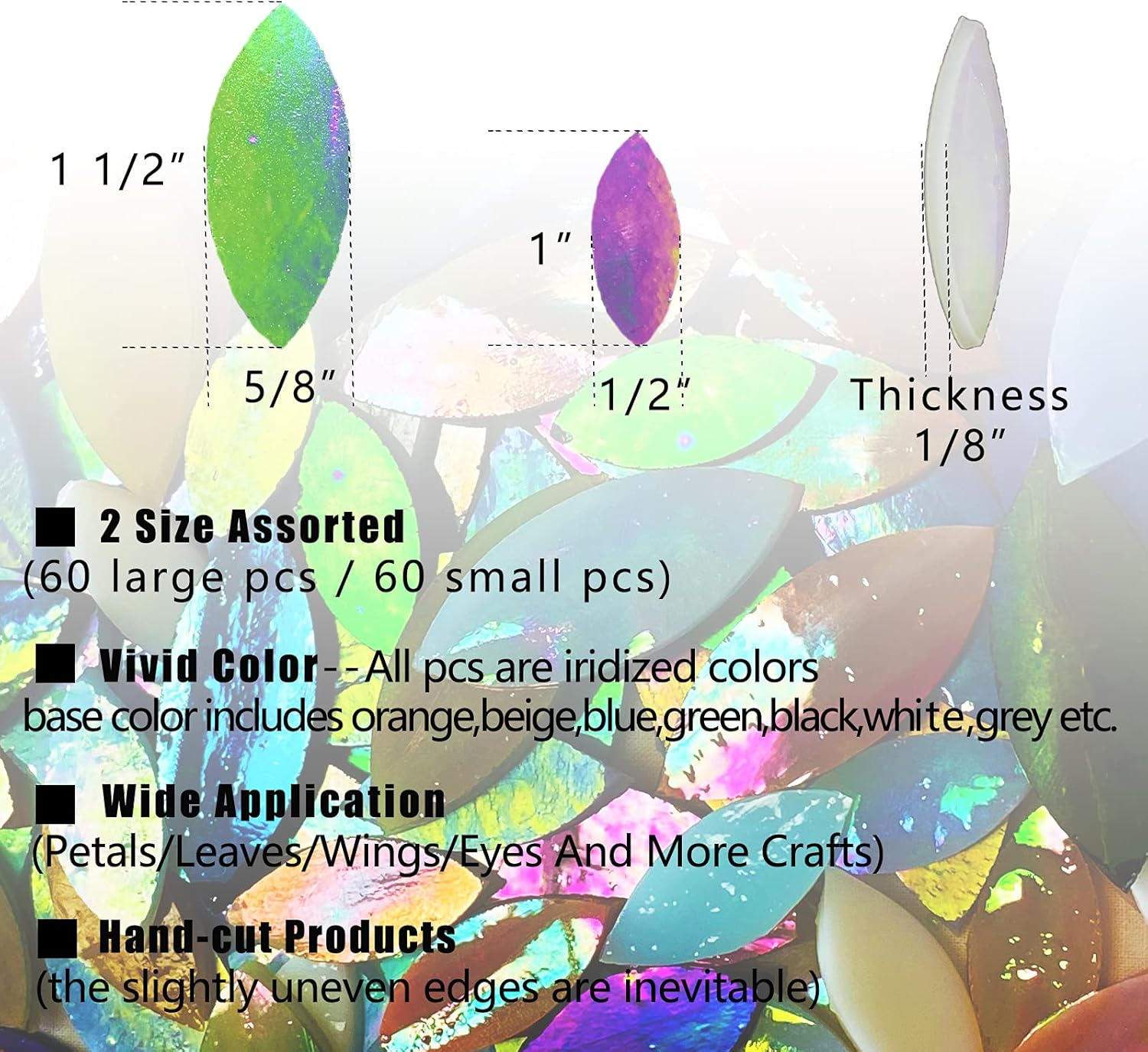 • Iridescent Colors: All pcs are iridized colors, base color includes orange,beige,blue,green,black,white,grey etc.