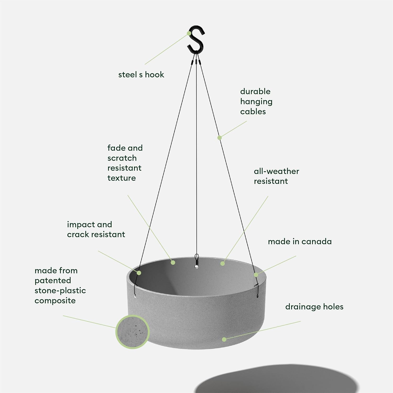 • DURABLE MATERIAL: Made from a plastic-stone composite, the Hanging Kona Bowl planter has a subtle textured finish and is all-weather resistant to cracks, scratches, UV and fading; perfect for hot or cold climates ranging from -20 to +120 degrees
