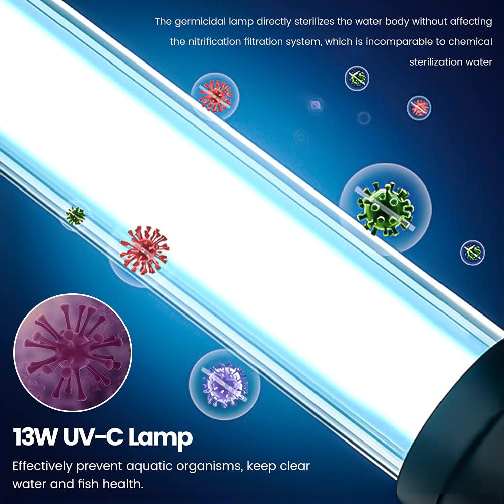 • 4 in 1 multifunctional system: 1. Filtration: The 37W pond pump can filter multiple times to purify the water quality. 2. Lamp: 13W work lamp effectively inhibit aquatic organisms and keep fish clean and healthy. 3. Pumping: The pumping flow can be adjusted to meet the daily pumping needs of the pond. 4. Fountain: Two fountain styles add charm to your pond.