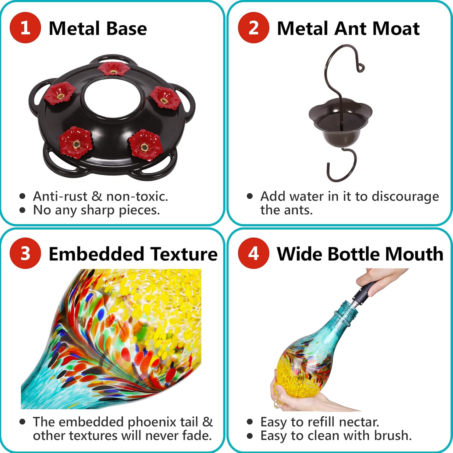 • SEE THROUGH RESERVOIR: Easy viewing of the nectar levels through the colorful and translucent glass reservoir. Double layers colored glass bottle. Much sturdier and heavier. Never fade