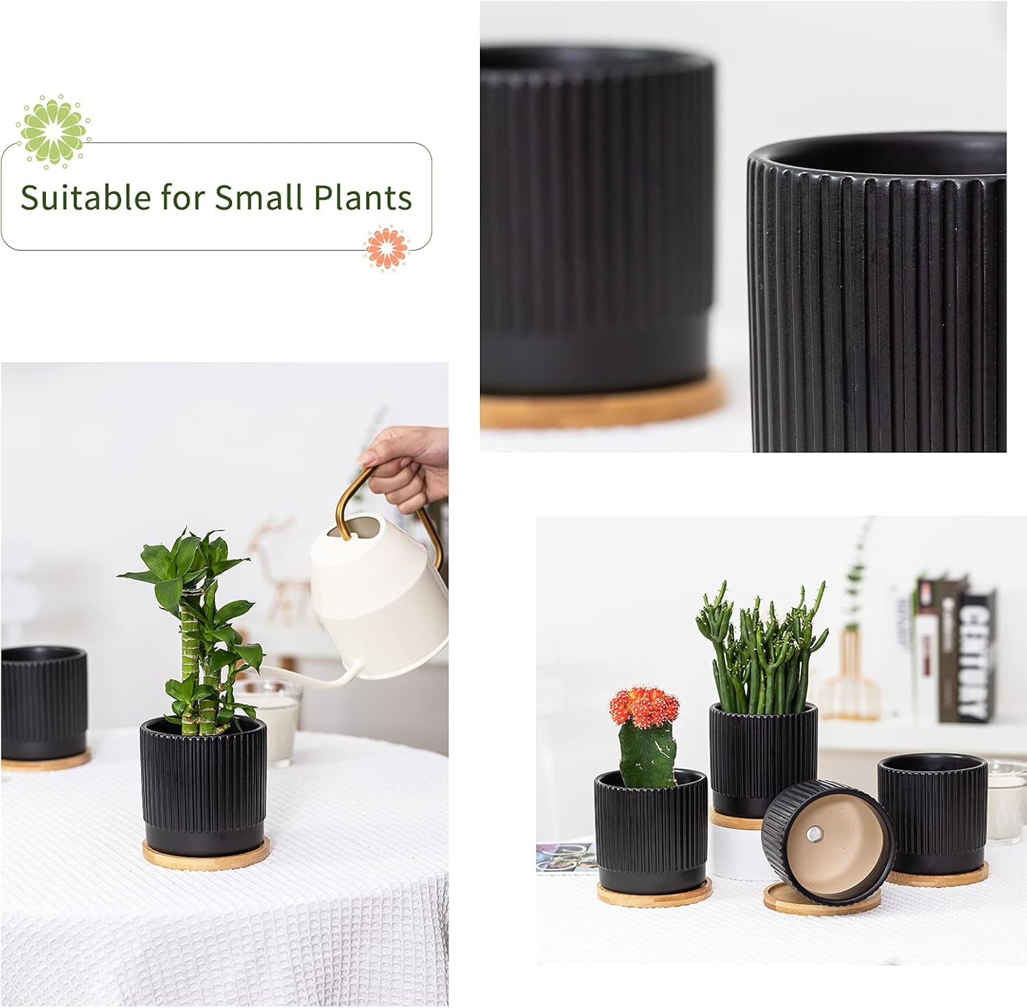 AOMRYOM 4.25 Inch Small Garden Ceramic Plant Pots with Drainage Holes and Tray, Modern Flower Planter Pots for Indoor Plants, Succulent, Cactus and Herbs, Black Stripe, Set of 4 (Plant Not Included)