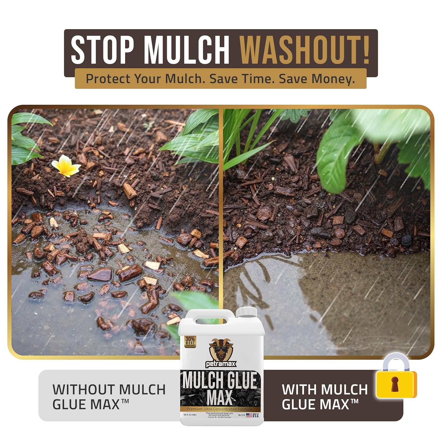 • SAY GOODBYE TO MESSY MULCH & PEBBLES FOREVER: Our Glue is the original landscape glue that powerfully holds garden mulch, wood chips, shells, sand, pine straw, small pebbles, hay and straw, small gravel, and leaf piles in place. No more mulch wash-outs on your sidewalk!