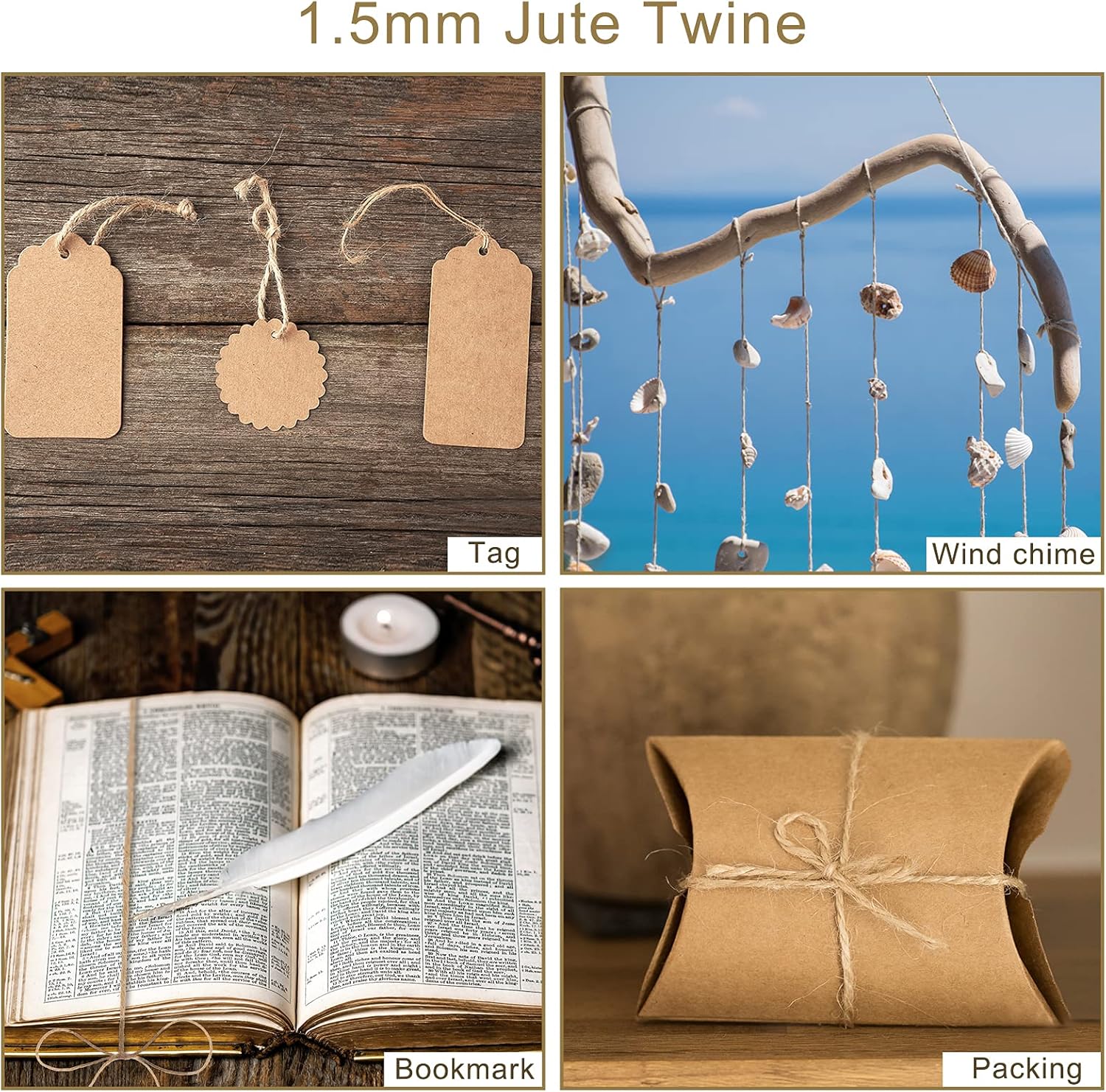 • 【Muti-Purpose】The 1.5mm and 2mm jute twine suitable for making hang tags, lanyards,gift packaging, knitting, etc.The 3mm perfect for DIY decorating all kinds of things,scrapbooking, hanging gift tags, wrapping packages, hanging decorations, gardening applications, or any arts and crafts project.The 6mm suitable for winding cat scratch boards, pipes, escalators, various walls, etc.