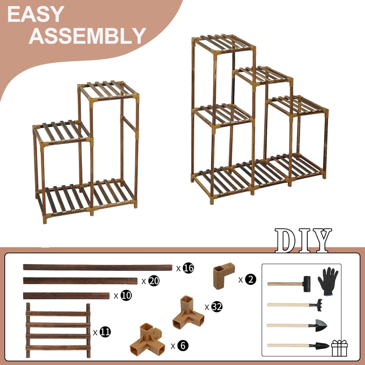 • Easy Assembly & Flexible Configuration: Be sure to watch the assembly video which helps you finish the plant shelf quickly. It offers flexibility in how you build it according to your space and usage. Gardening tools and gloves are provided as gifts. Ps: 2 kinds of joints used to connect the wooden pieces. 3-way joint and sticks have extra one in case. 2 dots on all joints must face up during assembling. Wrong direction may cause pieces do not fit together.