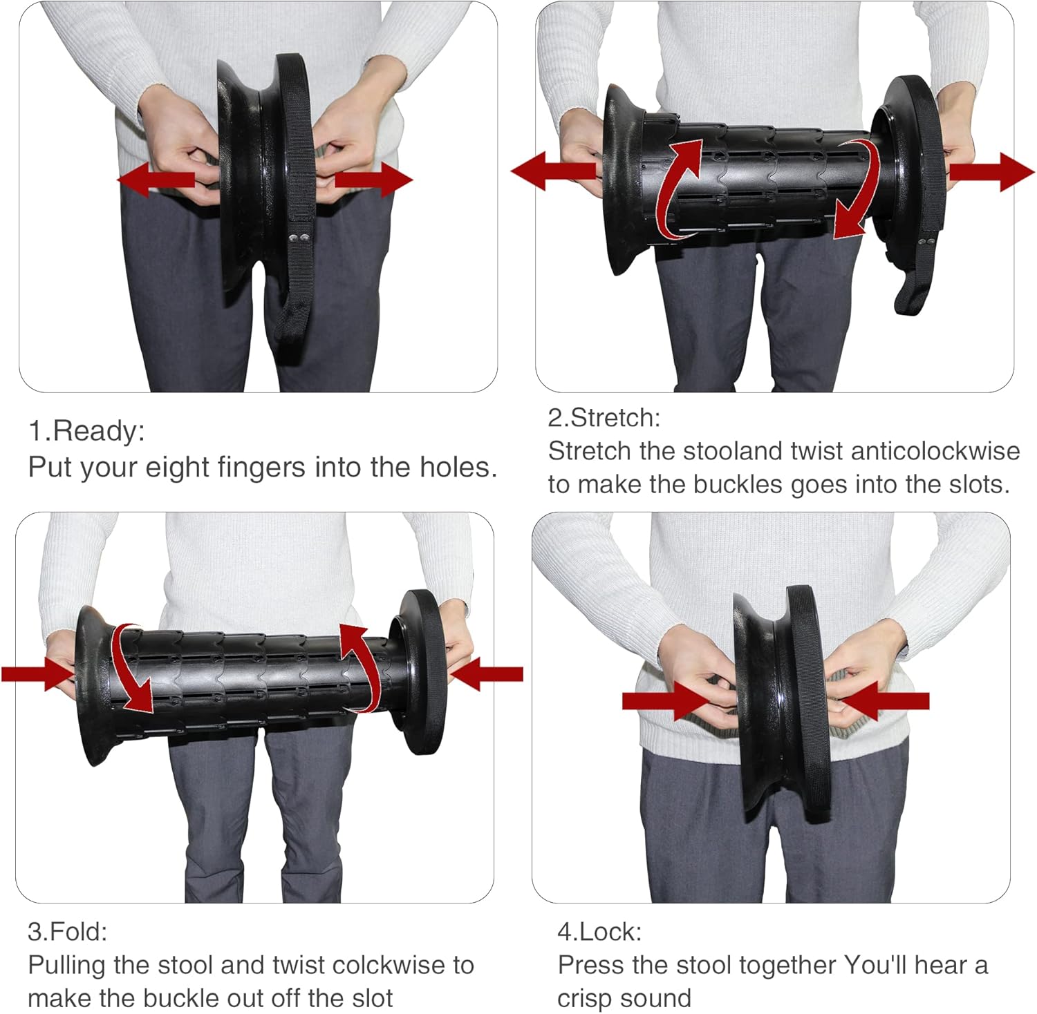 • 【Safety and High Stability】 Made of high-strength heavy duty environmental friendly material plastic PP, the cylinder shape structure, tight connecting clasps, and the non-slip base ensure the stability of collapsible stool. That provides safe and comfortable seat. The maximum load capacity is as much as 550 lbs(250kg)!