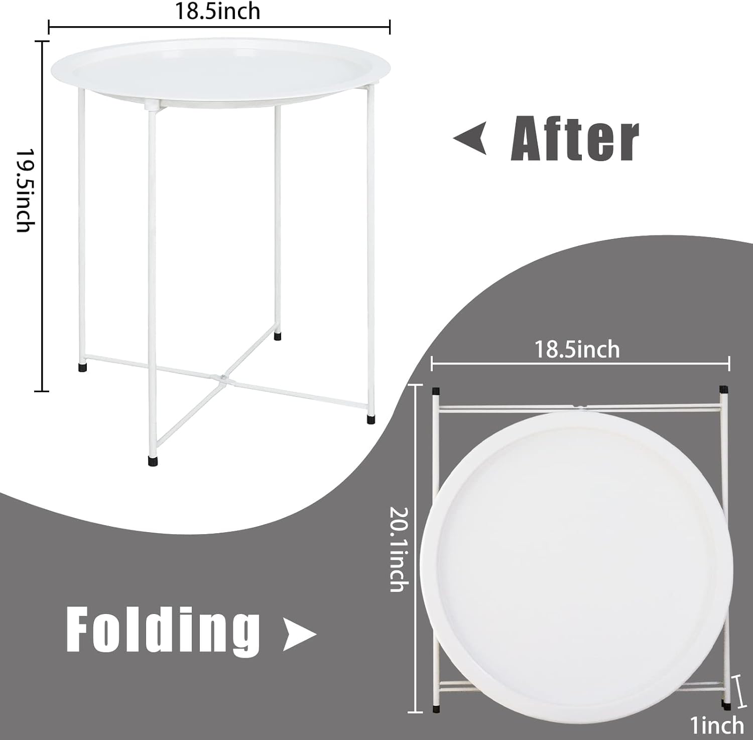 Garden 4 you End Table Metal Side Table White Round Folding Tray Cyan Sofa Small Accent Fold-able Table, Round End Table Tray, Next to Sofa Table, Snack Table for Living Room and Bed Room