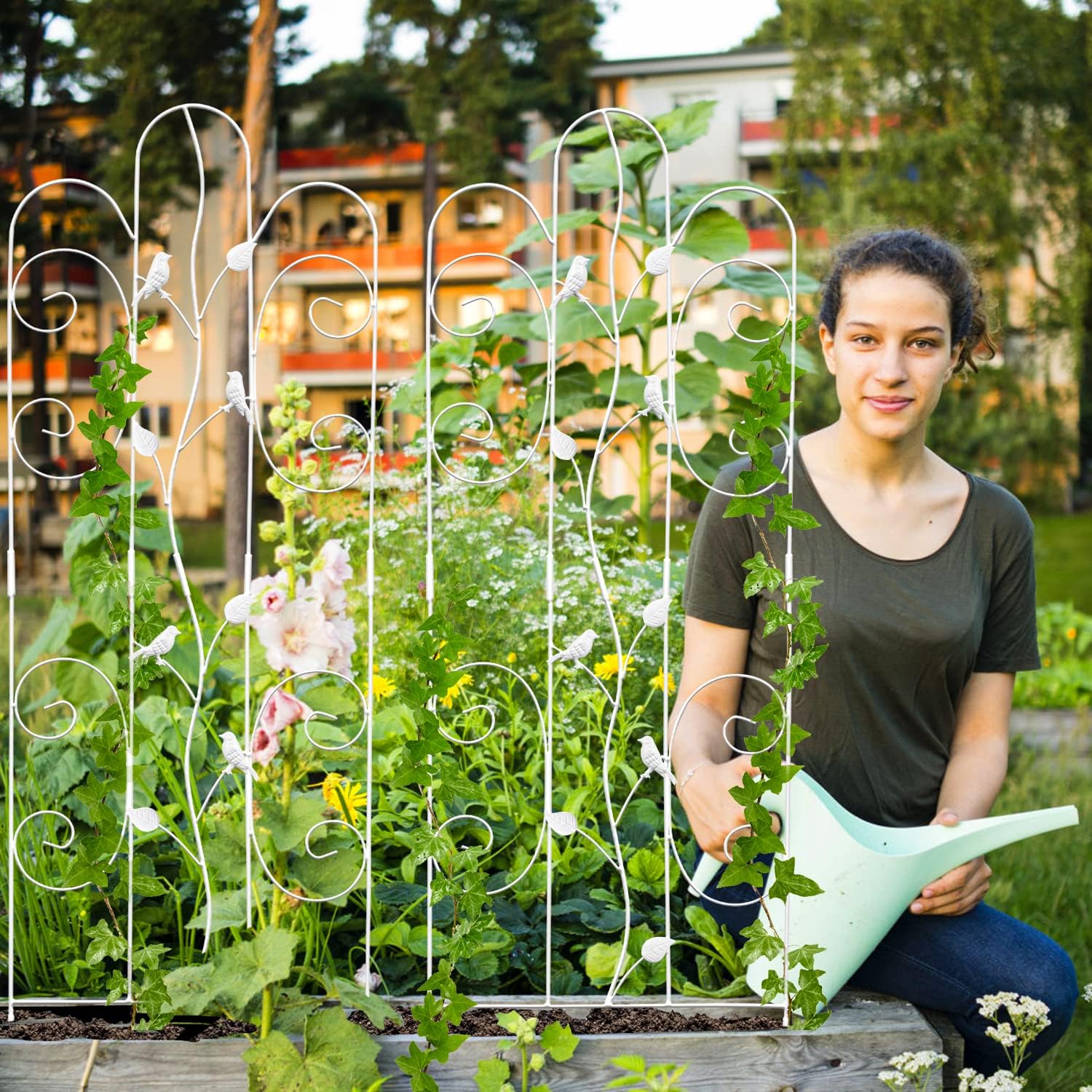 • MULTI PURPOSE METAL TRELLIS: This garden trellis for vegetables is suitable for clematis, climbing roses, vines, morning glories, beans, sweet peas, tomatoes, other vegetables, and more. You can also use bean trellis to form a sturdy screen or corner with more of it and provide support for climbing plants trellis while adding height and variety to your lovely garden