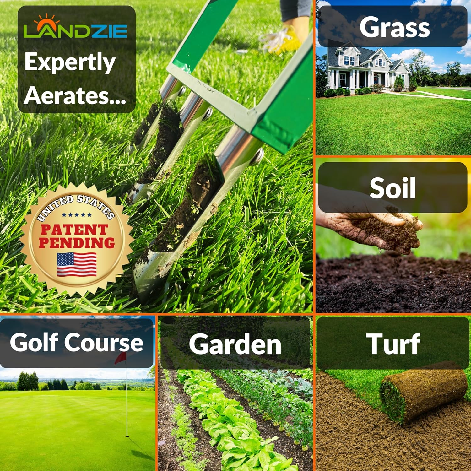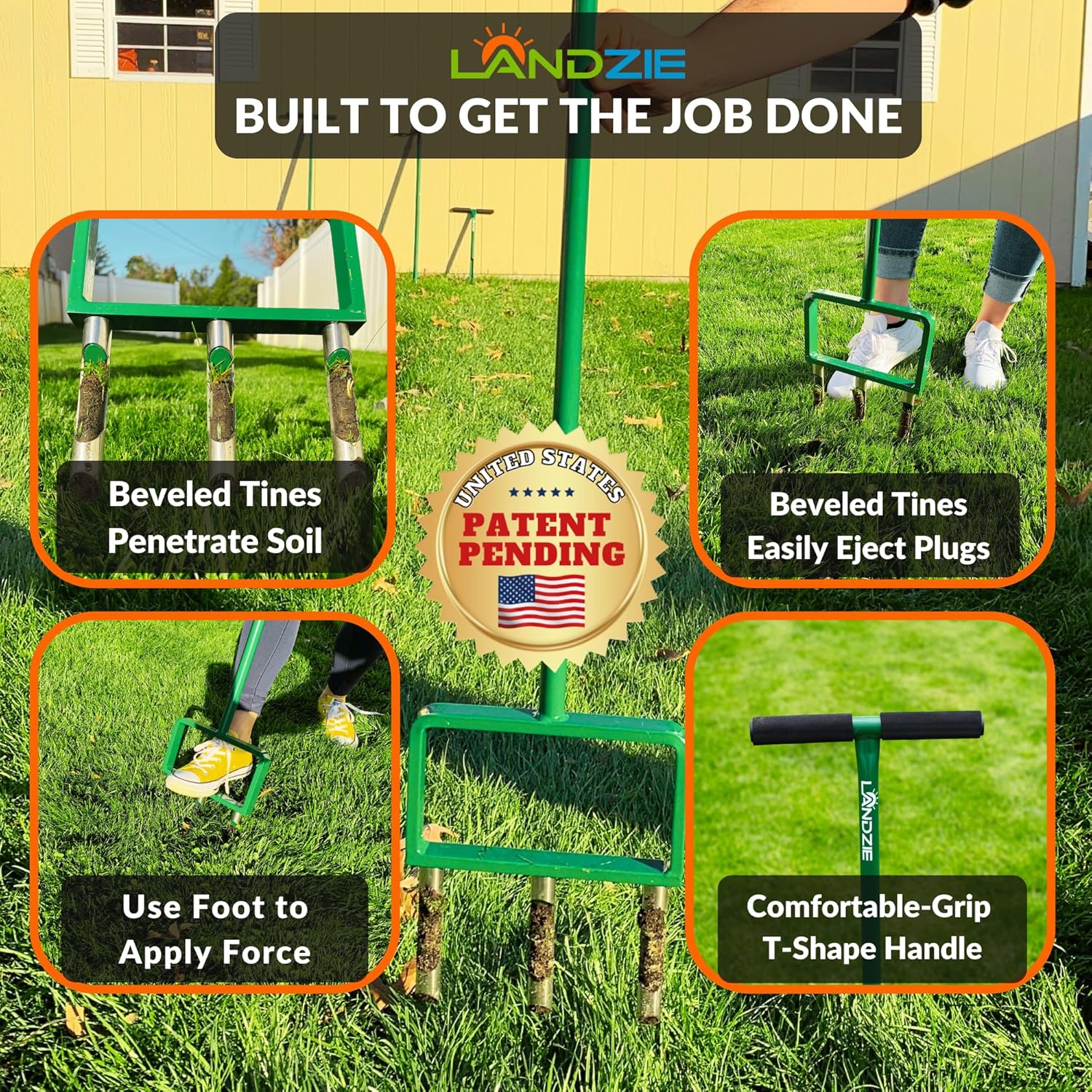 • REVOLUTIONARY CLOG-FREE BEVELED TINES: Landzie has revolutionized the core aerator lawn tool industry by designing a hollow tine lawn aerator tool and lawn core aerator that removes cores of soil. Three solid, stainless steel tines break up soil and allow air, water, and nutrients to penetrate more deeply into the soil, pushing old material up and out of the manual aerator lawn tool each time you press the Landzie Plug Lawn Aerator into the ground. No need to unclog your manual core aerator
