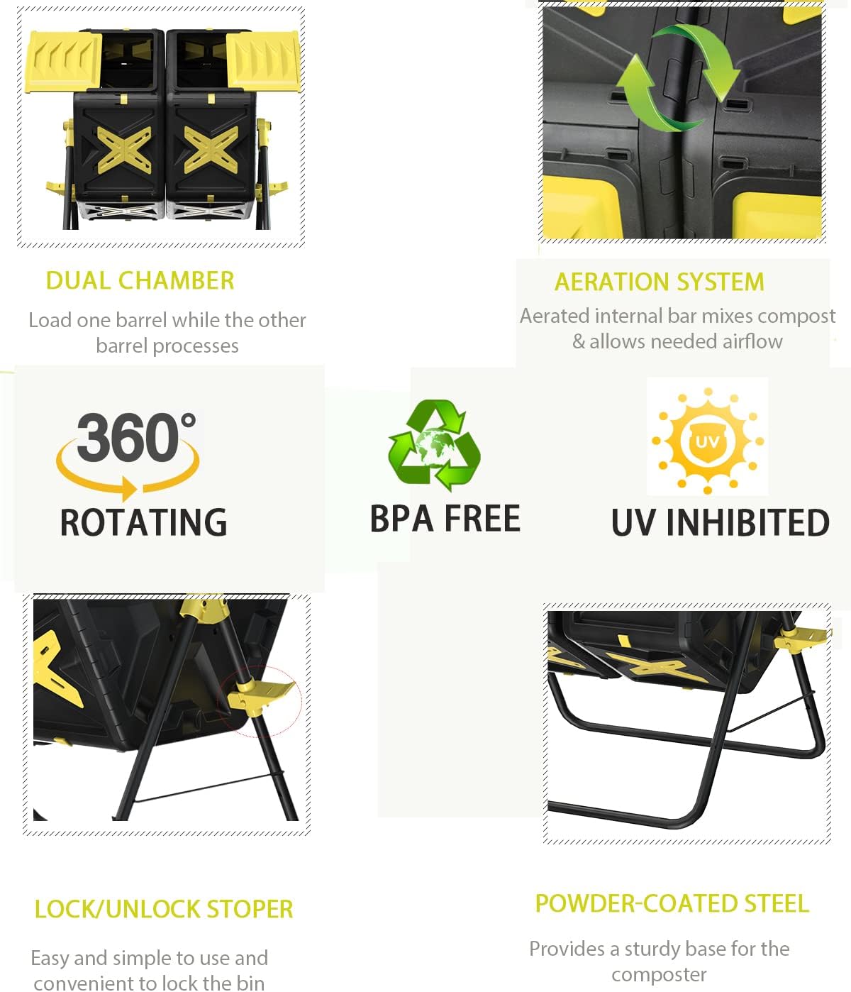 • AERATION SYSTEM- Aerated internal bar mixes compost & allows needed airflow.Black, double-wall panels absorb and retain heat.Perfectly suited for your garden and for people not wanting to mix the organic waste in their traditional compost bin.
