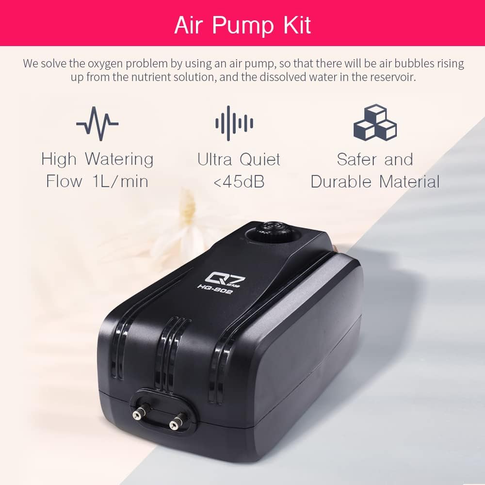 • EFFICIENT AIR PUMP KITS: Air Pump with 2 outlets, includes 2x Check Valve, 2x Air Stone, 2x 5ft Air Tubing. Large air outlet, adjustable air flow is up to 1L/min and UP TO 265 gallons. Air Stone is an ideal way to add oxygen to your hydroponic growing system and create tiny bubbles rather than bigger ones. Oxygenation of hydroponic reservoirs using air pumps is vital for the health of root system.