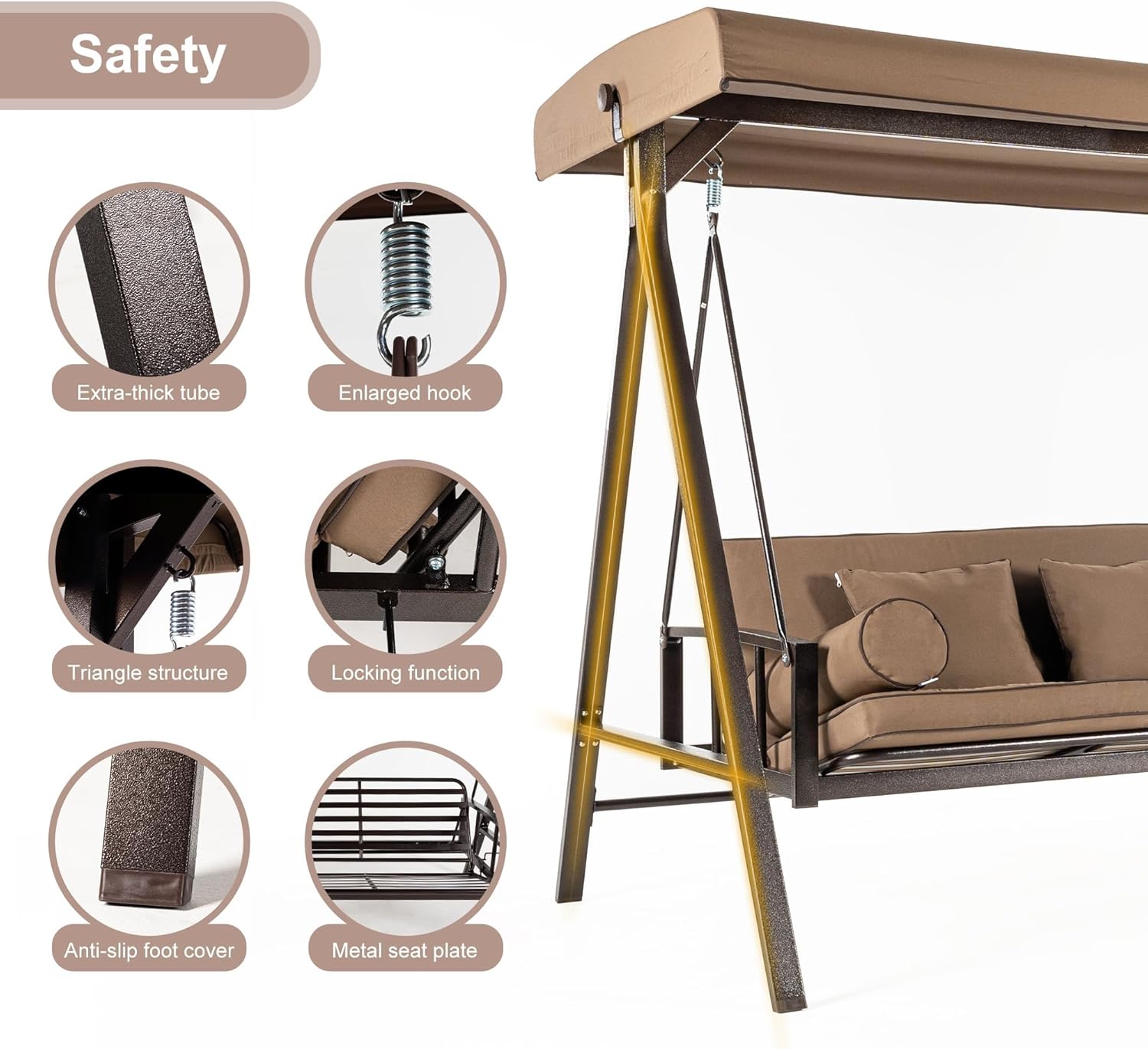 PURPLE LEAF Outdoor Patio Porch Swing Adjustable Backrest, 3-seat Swing Chair with Weather Resistant Steel Frame for Backyard Front Porch Lawn, Cushion and Pillows Included, Beige