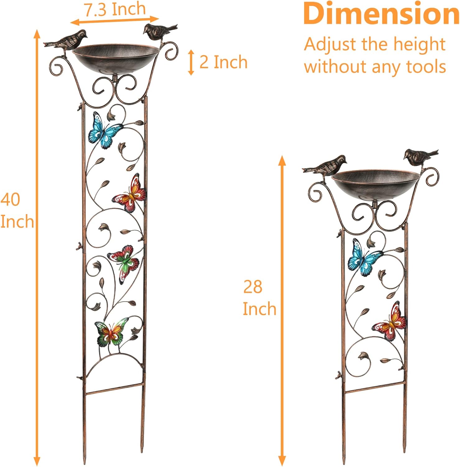 • 【Elegant Design 3 in1】It features 2 decorative metal birds and a bowl as the bird bath at the top can attract birds here to take a bath. 4 bright-colored butterflies on the trellis create a conducive environment for climbing flowers. It also can be left unadorned to lend sculptural interest to garden, flower bed or border.