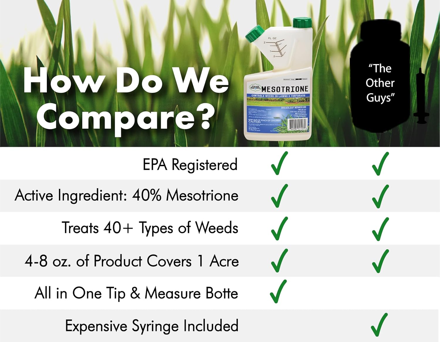 • Targeting 46 broadleaf species and grasses, including Barnyard grass, Carpetweed, Chickweed, Clover, Crabgrass, and Dandelion, Mesotrione is versatile.