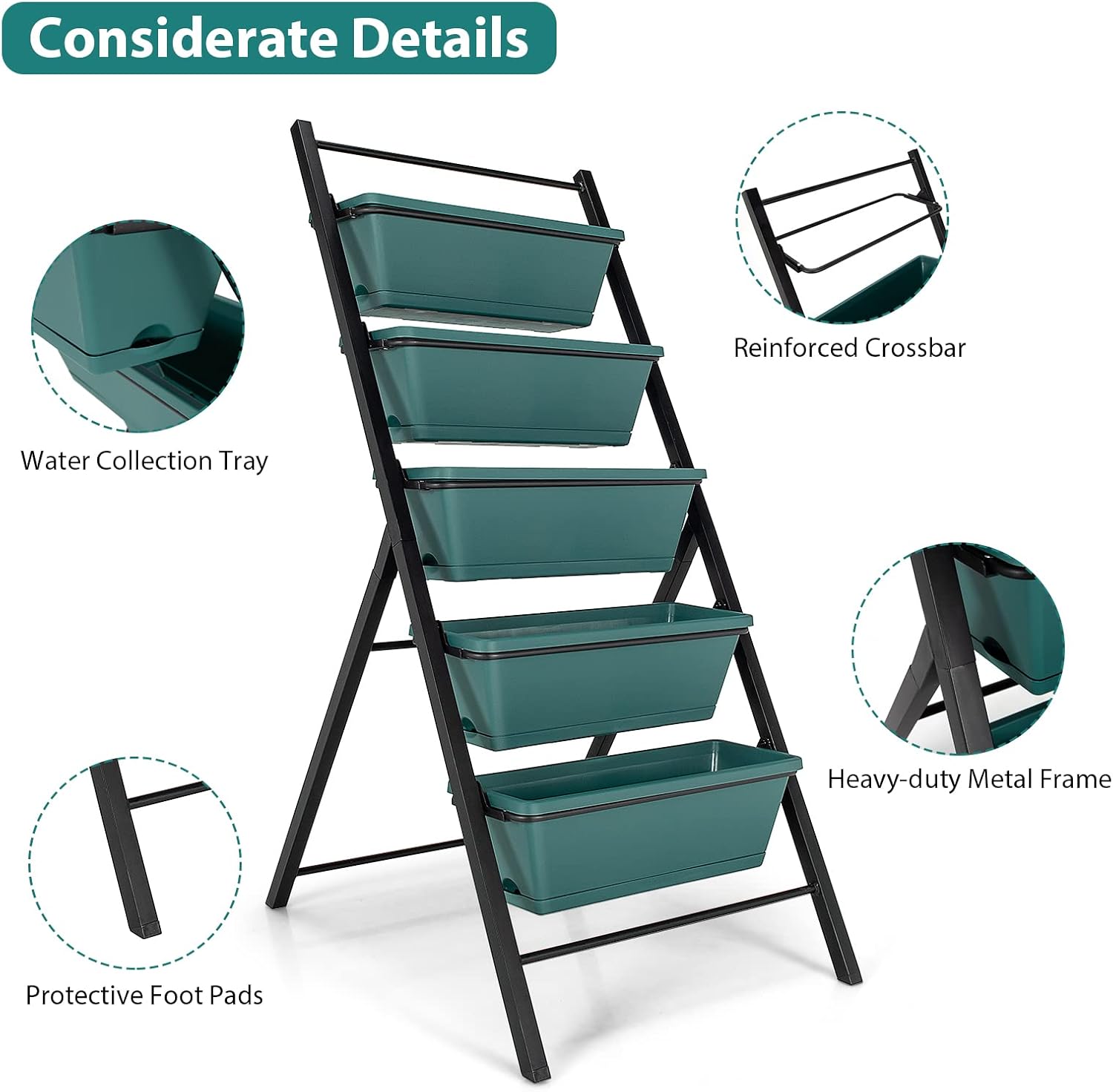 • 『5 Plant Container Box』: This 5-tier vertical garden is equipped with 5 PP made container boxes, which are durable for long-term use in both outdoor and indoor environment. Each box can hold 0.5 cubic feet volume of soil and its weight should no more than 22lbs. Your plants could have a warm home and grow healthily.
