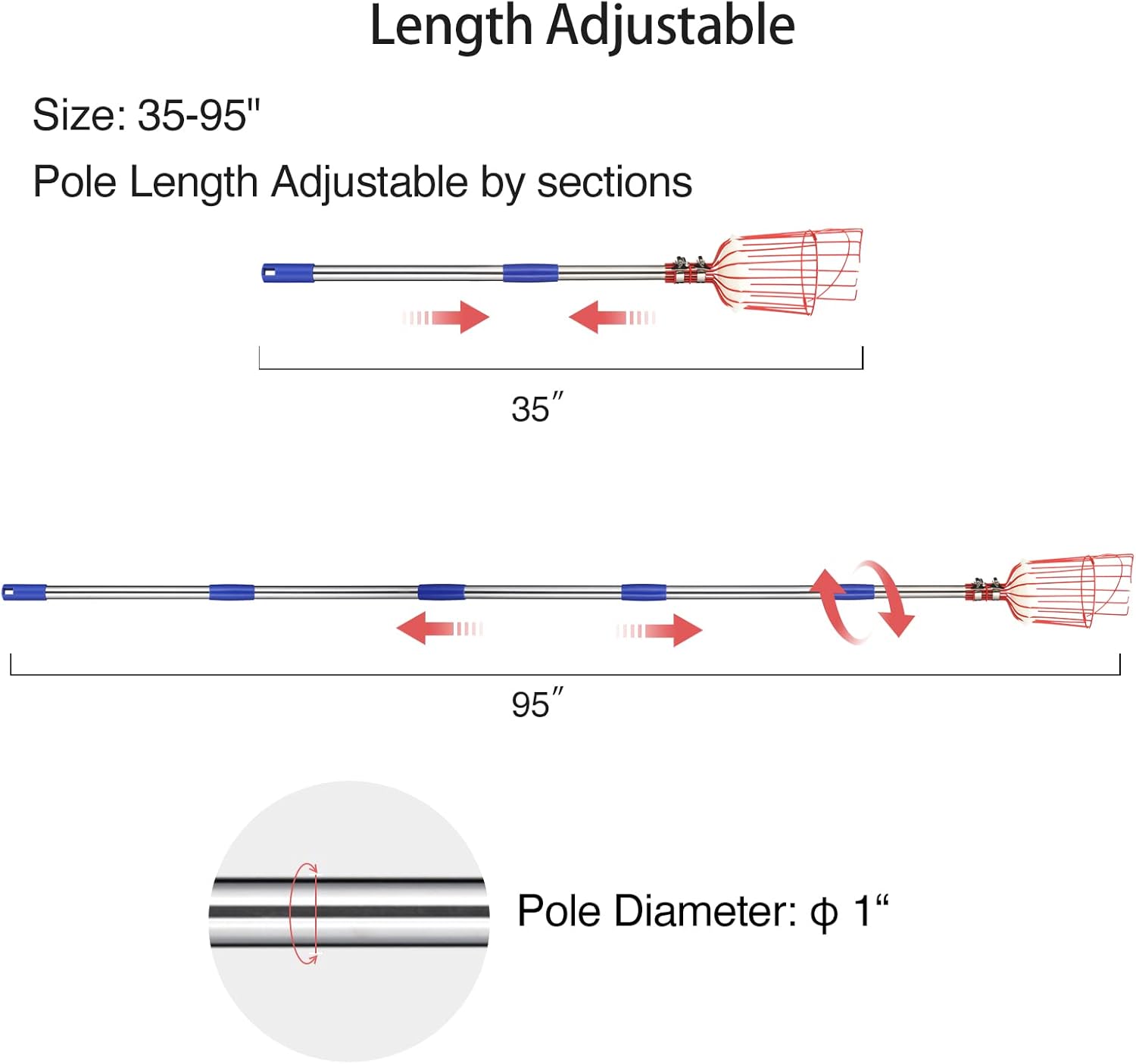 • ▼【Length Adjustable】Cherry picker tool length is adjustable by sections to be 35" to 95" which is safer and more efficient to get fruit from tall trees without falling off a ladder any more.