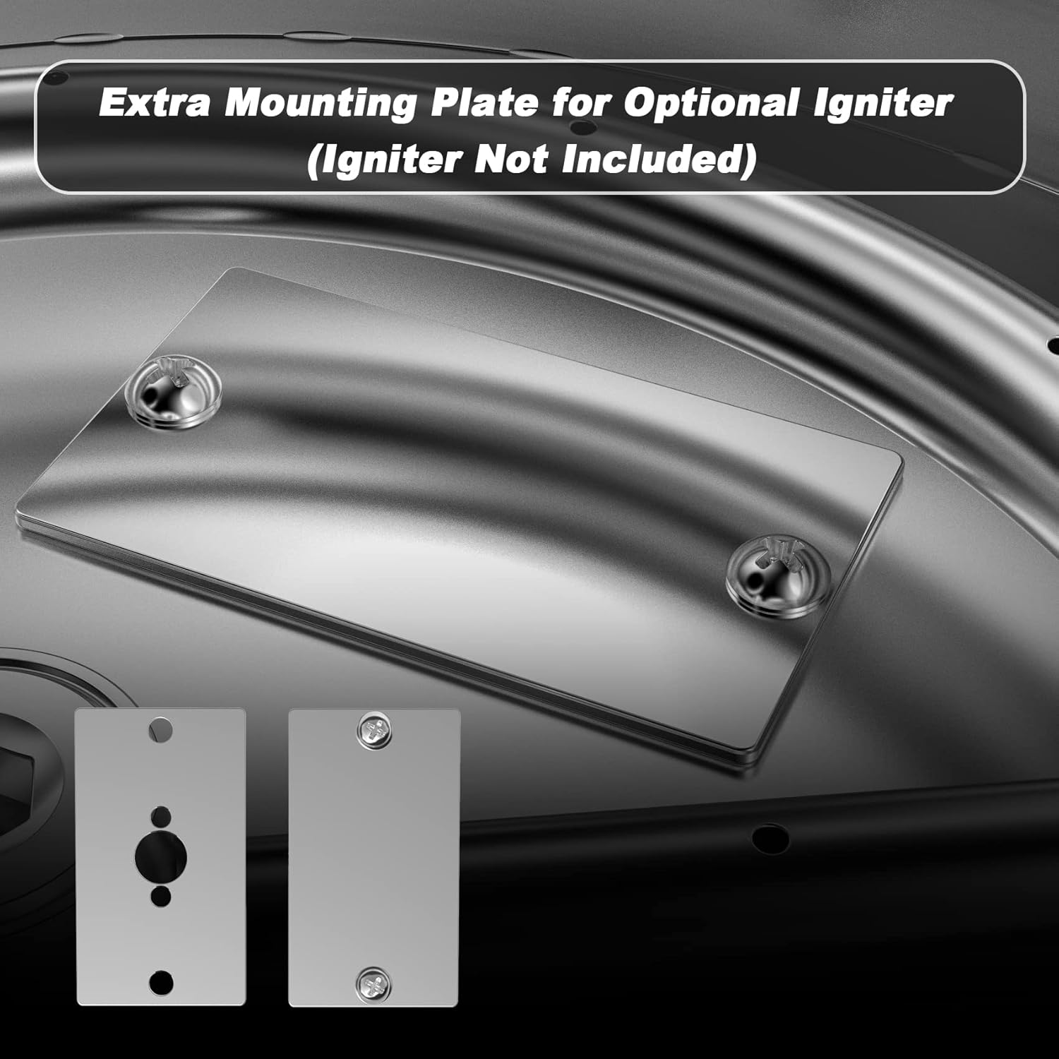 • Male 1/2 inch gas inlet in bottom center of pan for easy Installation; extra mounting plate for optional igniter (igniter not included). Built-in weep holes in the pan to prevent water accumulation.