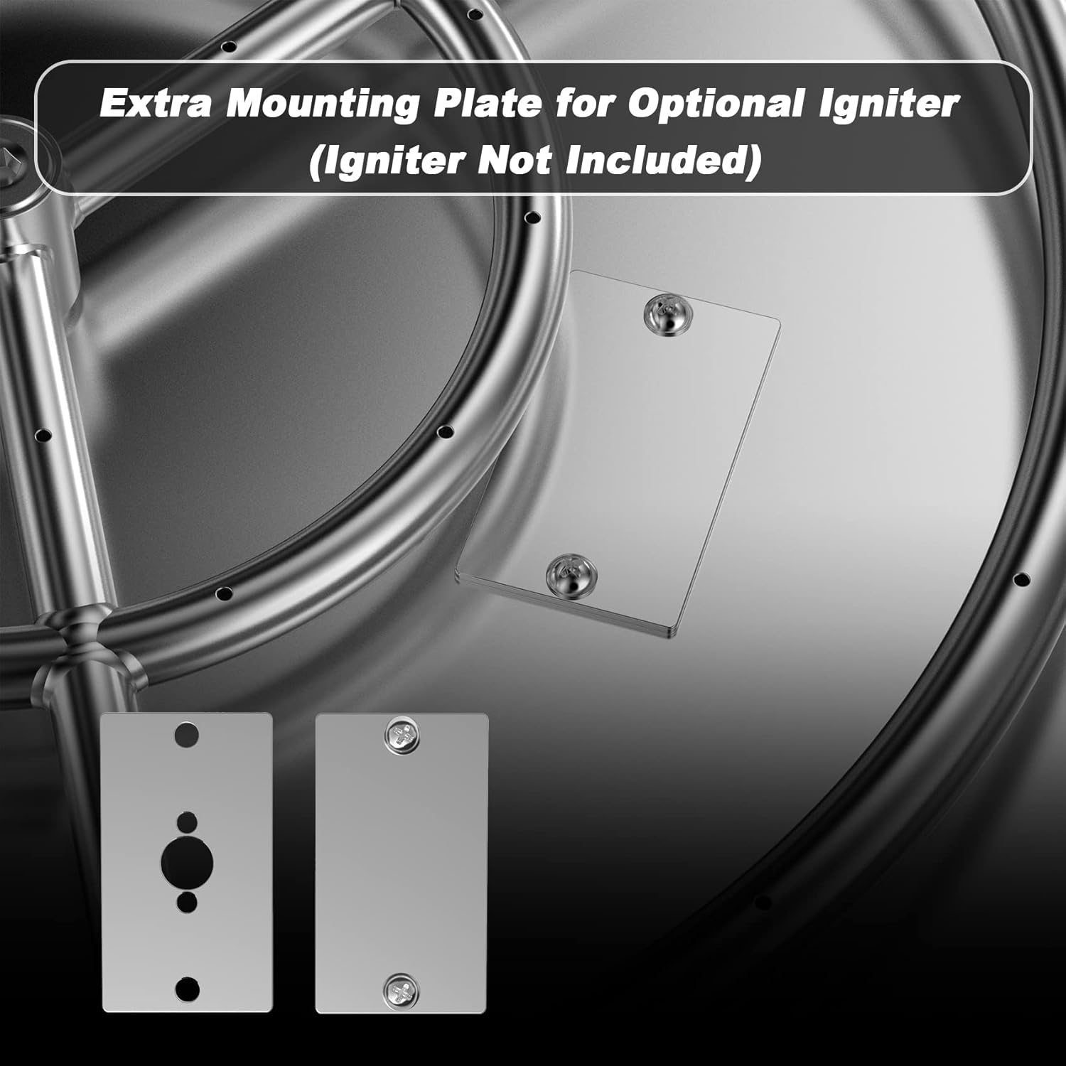 • Male 1/2 inch gas inlet in bottom center of pan for easy Installation; extra mounting plate for optional igniter (igniter not included). Built-in weep holes in the pan to prevent water accumulation.
