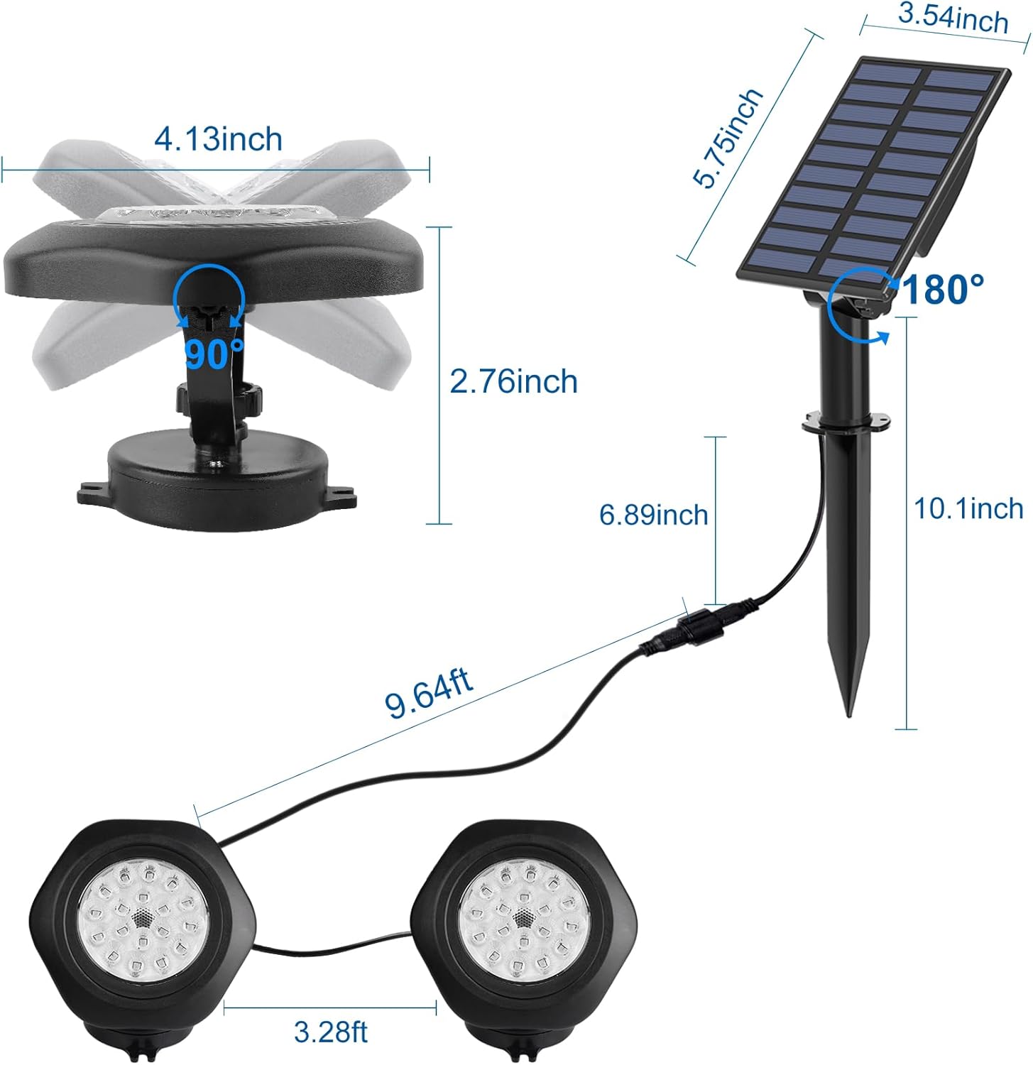 • 2-in-1 Solar Outdoor Lights Features: Adjustable, Brighter & Longer Wire. The light heads can be adjusted 90 degrees. One light have 18 LED beads, total 54 LED, Super bright, comes with 13ft/4m wire, more flexible and convenient to use. Low voltage and anti-leakage. IP68 protection level, suitable for outdoor use as landscape spotlights , can withstand harsh weather. It can also be used in indoor aquariums and ponds