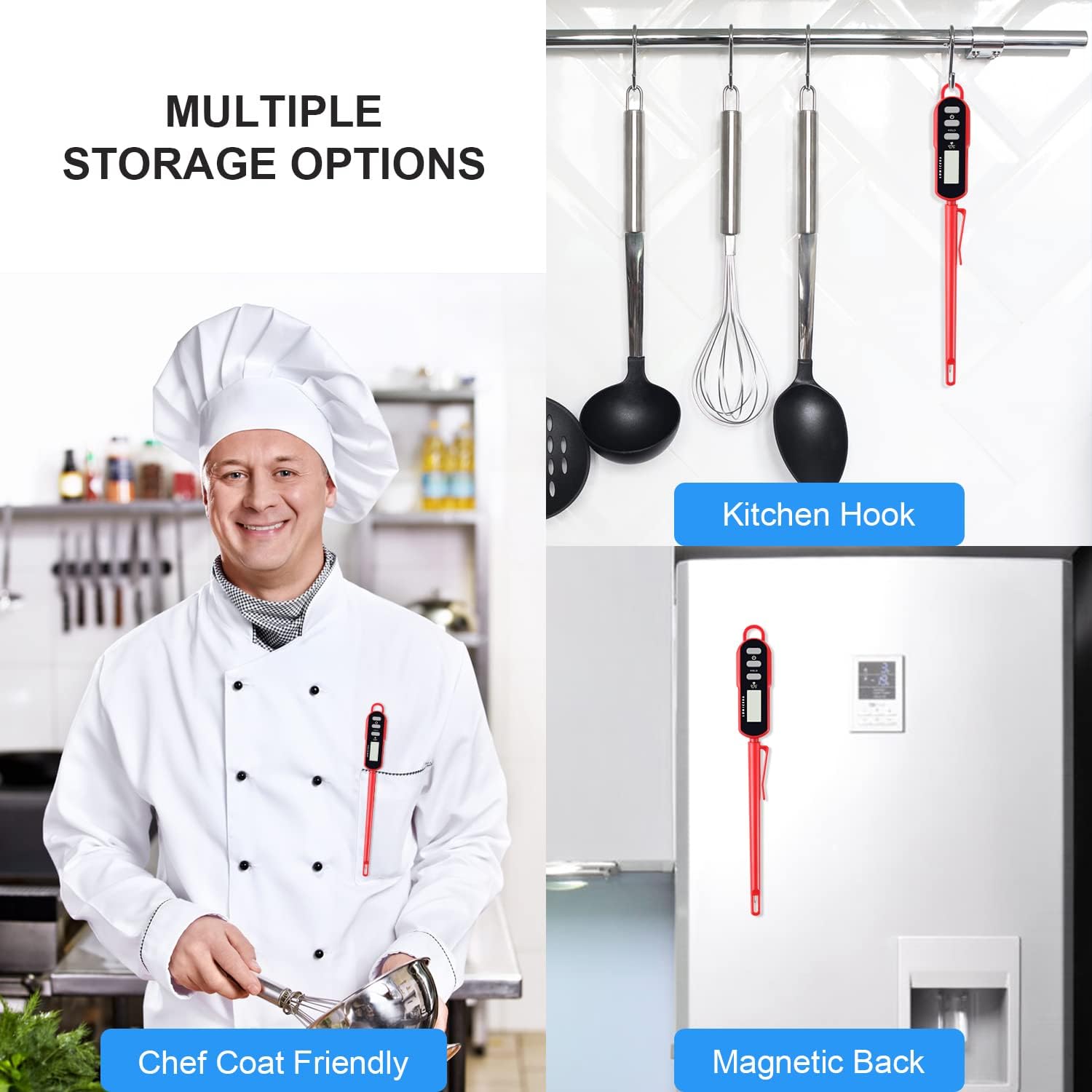 • WATERPROOF & LONG PROBE - Cooking thermometer with IPX6 rated waterproof, clean it freely under running water. Keep you away from hot food safely with 5.1 inch food grade long probe, pocket sleeve clip included