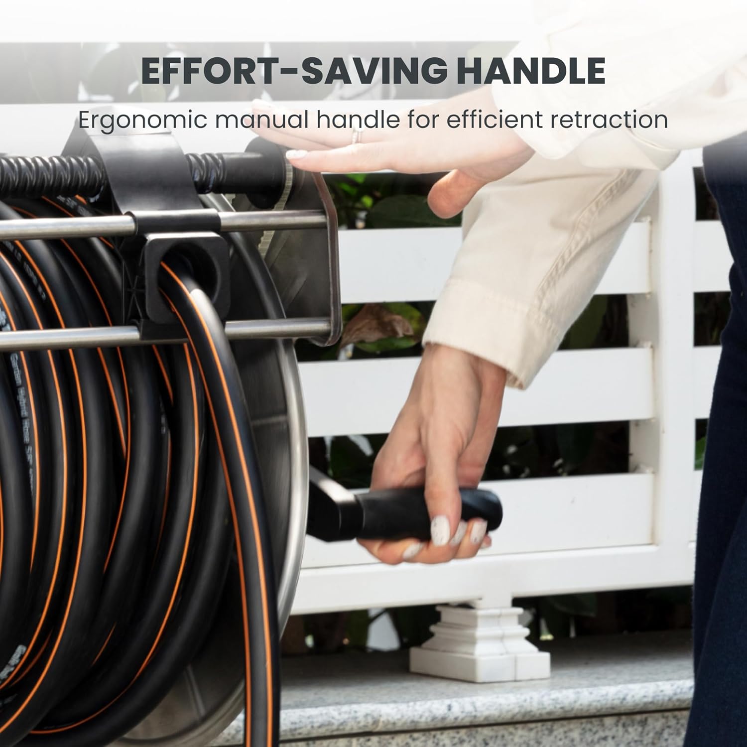 • EASY WINDING - Make garden hose storage simple and clean! The easily assembled crank handle and the hose guide with garden hose reel help you manually wind the hose evenly around the reel with less mess.