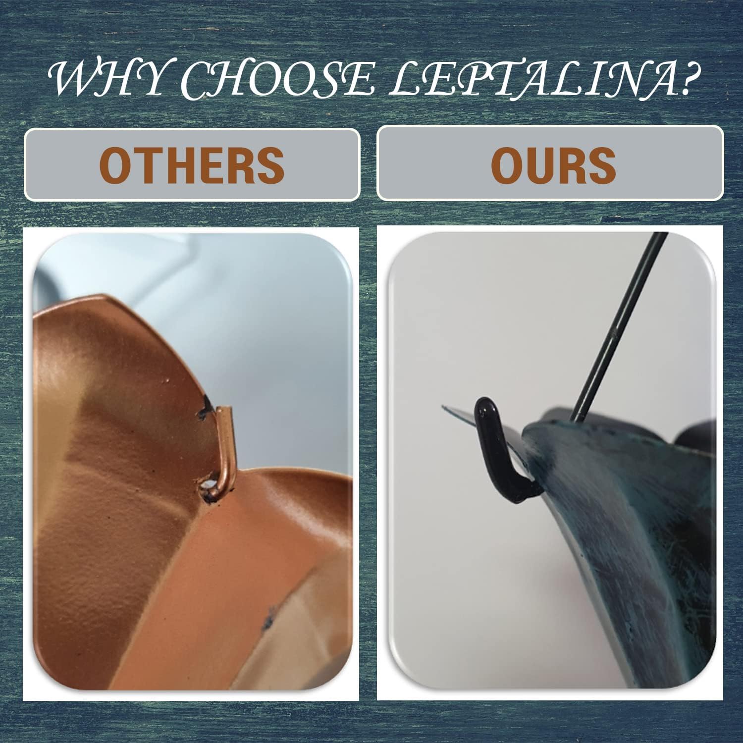 • We make our rain chains last, so we’ve coated each link and cup with rust-proof electrical paint. Moreover, the rain chains are incredibly sturdy, so they stay anchored to your gutters in the strong winds.